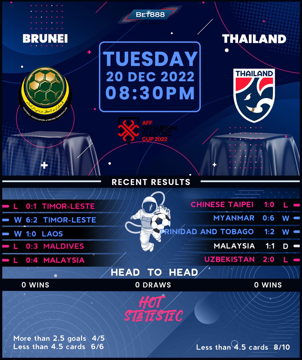 Following a brace of wins over Laos and East Timor via an aggregate score of 7-2, Brunei slipped to a keenly-contested 1-0 defeat at East Timor in the build-up to this fixture. Curiously, since a penalty shootout loss to Macau in 2016, none of Brunei’s subsequent 14 internationals have finished as a draw (W4, L10), highlighting their propensity for playing ‘winner takes all’ matches. With eight (57%) of those games (won/lost) seeing the winner keep a clean sheet, opening the scoring could be a catalyst to sway this encounter each way. But it’s worth noting that the last time Brunei met a nation of Thailand’s caliber, they found themselves on the wrong side of a 4-0 scoreline against Malaysia earlier this year.
