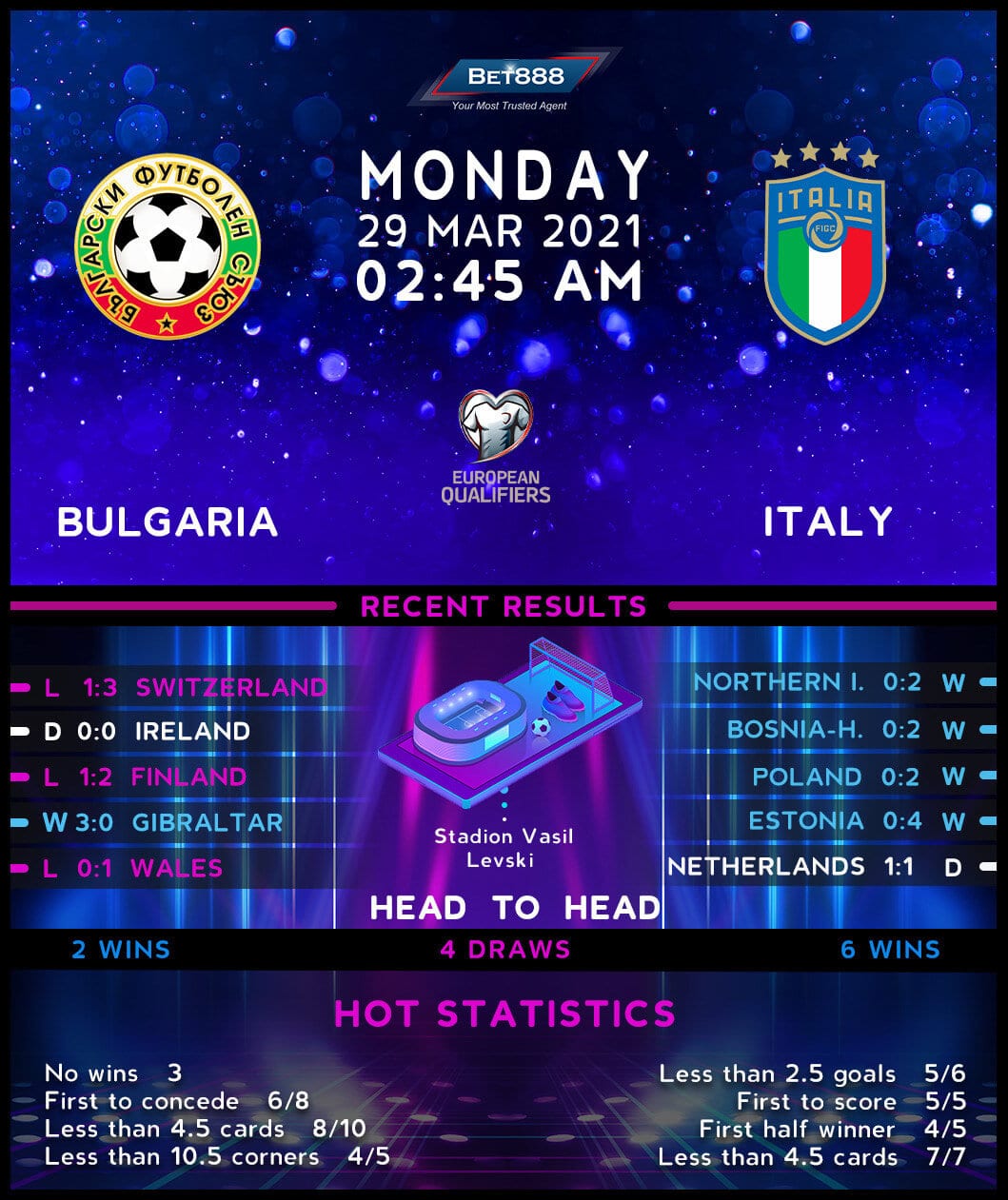 Having found themselves on the wrong side of a 3-1 scoreline in their World Cup Qualifying opener against Switzerland, Bulgaria come into this fixture winless in eight competitive matches in a row (D2, L6). If they want to qualify for their first World Cup finals in the 21st century, the ‘Lions’ need all three points against an Italian side they’ve failed to beat in their previous five competitive H2Hs (D4, L1). Moreover, the Bulgarians have lost each of their last four competitive games on home soil, falling behind within 20 minutes three times in the process. A potentially high-scoring affair is on the cards, though, as four of the six competitive H2Hs between these nations have seen over 2.5 goals and both teams scoring, with each of the last two yielding the identical 2-2 scoreline.