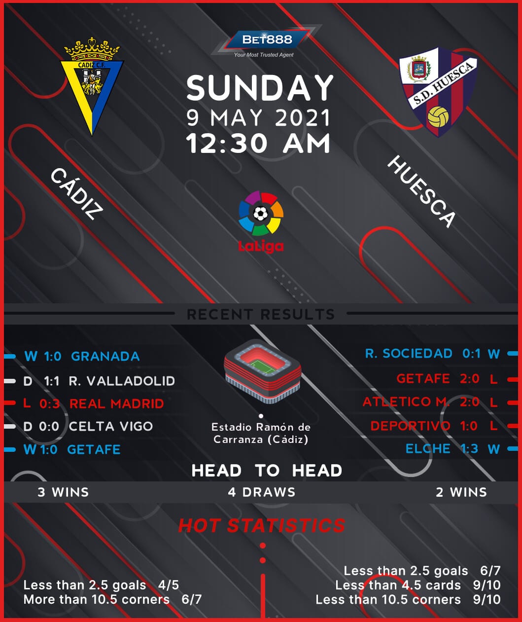 Meanwhile, Huesca benefited from Aritz Elustondo’s 87th-minute own goal last time out as they outscored Real Sociedad 1-0, bringing a three-match losing La Liga streak to a halt. However, it means Huesca’s players have failed to score in four consecutive league fixtures, having drawn a blank in both of their previous La Liga trips. But, Pacheta’s team have racked up three triumphs in their last six league games (L3), recording as many wins as in their first 28 matchdays this season (W3, D12, L13). Huesca’s hopes of avoiding defeat here will rely on a good start, given that they’ve ended up on the losing side in 90% of the away La Liga matches in which they conceded first this term (GP10 – D1, L9). Huesca have failed to beat Cadiz in their last five competitive H2Hs on the road (D3, L2), all of which featured under 2.5 FT goals.