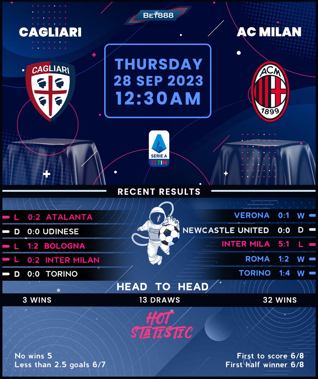 On the other hand, Milan bounced back from their notorious Derby della Madonnina fiasco with a narrow 1-0 home triumph over Hellas Verona at the weekend, making it four wins in the opening five rounds. After a leaky three-game sequence where they failed to keep a clean sheet, ‘I Rossoneri’ have racked up back-to-back shutouts, including a scoreless home draw against Newcastle United in their opening Champions League fixture. That bodes well for the visitors’ bid to post a fourth consecutive Serie A victory at Cagliari ‘to nil’ and maintain their resurgence after a 5-1 thumping at the hands of Inter. But Stefano Pioli’s formational shift from his usual 4-3-3 to a 3-4-3 has made Milan less potent in attack, netting precisely once in their last two league games.