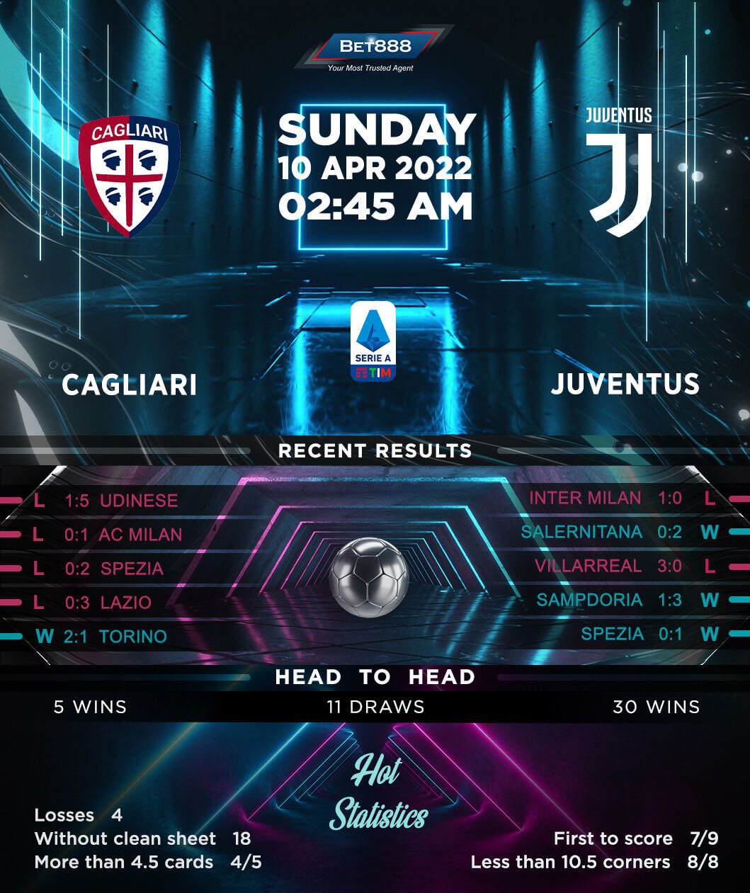 Cagliari will be desperate to bounce back from a disheartening 5-1 defeat at Udinese last time out as part of their bid to secure Serie A survival. However, the ‘Sardinians’ come into this weekend having lost their last four league matches in a row and are three points clear of the relegation zone only because the teams from the drop zone all lost on the previous matchday. Cagliari’s hopes of pulling off an upset here are rather slim, though, considering that they’ve lost nine of their last ten top-flight H2Hs as hosts, conceding 3+ goals five times in this run. Walter Mazzarri’s men can ill-afford to let Juventus shoot from a distance, as they’ve shipped a league-high 12 goals from outside the box during this Serie A campaign.