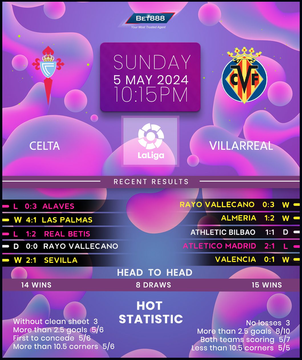 Visiting Villarreal reigned supreme against Rayo Vallecano last weekend, steamrolling to a 3-0 home victory to make it two league wins on the trot after back-to-back winless outings beforehand (D1, L1). A late European push is on the cards again, as they trail seventh-placed Betis by four points ahead of the last five rounds. Villarreal’s superb away form can only add to manager Marcelino Garcia Toral’s confidence, with his side going unbeaten on their six most recent La Liga travels (W4, D2) despite failing to keep a clean sheet in that run. In fact, not since a goalless draw at Getafe in September have ‘El Submarino Amarillo’ registered an away shutout in league action! On the contrary, they’ve conceded an average of just 0.5 goals per game across their last four top-flight visits to Celta (W2, D2).