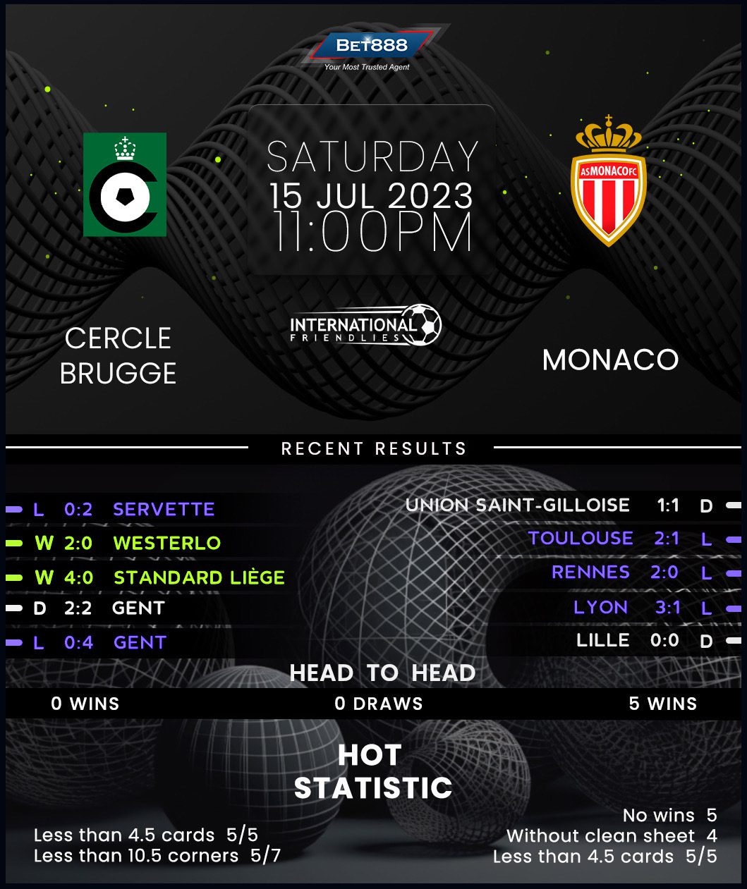 Cercle Brugge missed out on European qualification last season, finishing eight points behind 5th-placed Gent despite signing off with back-to-back victories over Westerlo and Standard Liege by an aggregate score of 6-0. But their summer campaign has started with a whimper rather than a bang, as they’ve drawn a blank in both friendlies against Dender and Servette (D1, L1). Though Cercle Brugge’s attacking performances in July leave a lot to be desired, manager Miron Muslic can be proud of his team’s defensive effort after overseeing three clean sheets in his last four matches. The Belgians’ defensive resilience will be put to the test by a Monaco side that has beaten them in all five previous summer friendlies.