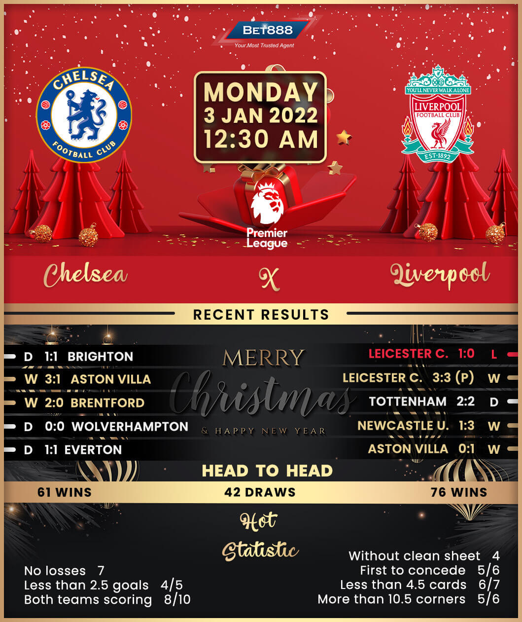 Brighton’s late equalizer that snatched away a 1-1 draw in Chelsea’s final game of 2021 saw the ‘Blues’ lose precious ground on Premier League leaders Manchester City, making it three draws from their last four league games (W1). A game in hand over City, coupled with a whopping 11-point deficit, suggests this could be a pivotal fixture for Chelsea’s hopes of landing their first Premier League title since 2015/16. So a return to Stamford Bridge, where they haven’t lost any of their last ten competitive matches (W5, D5), must be pleasing for Thomas Tuchel. Not so much, though, as his men have lost their last two Premier League meetings with Liverpool after going unbeaten twice in a row beforehand (D1, L1). Moreover, the reigning Champions League holders haven’t won their inaugural league fixture in any of the last five calendar years (D3, L2).