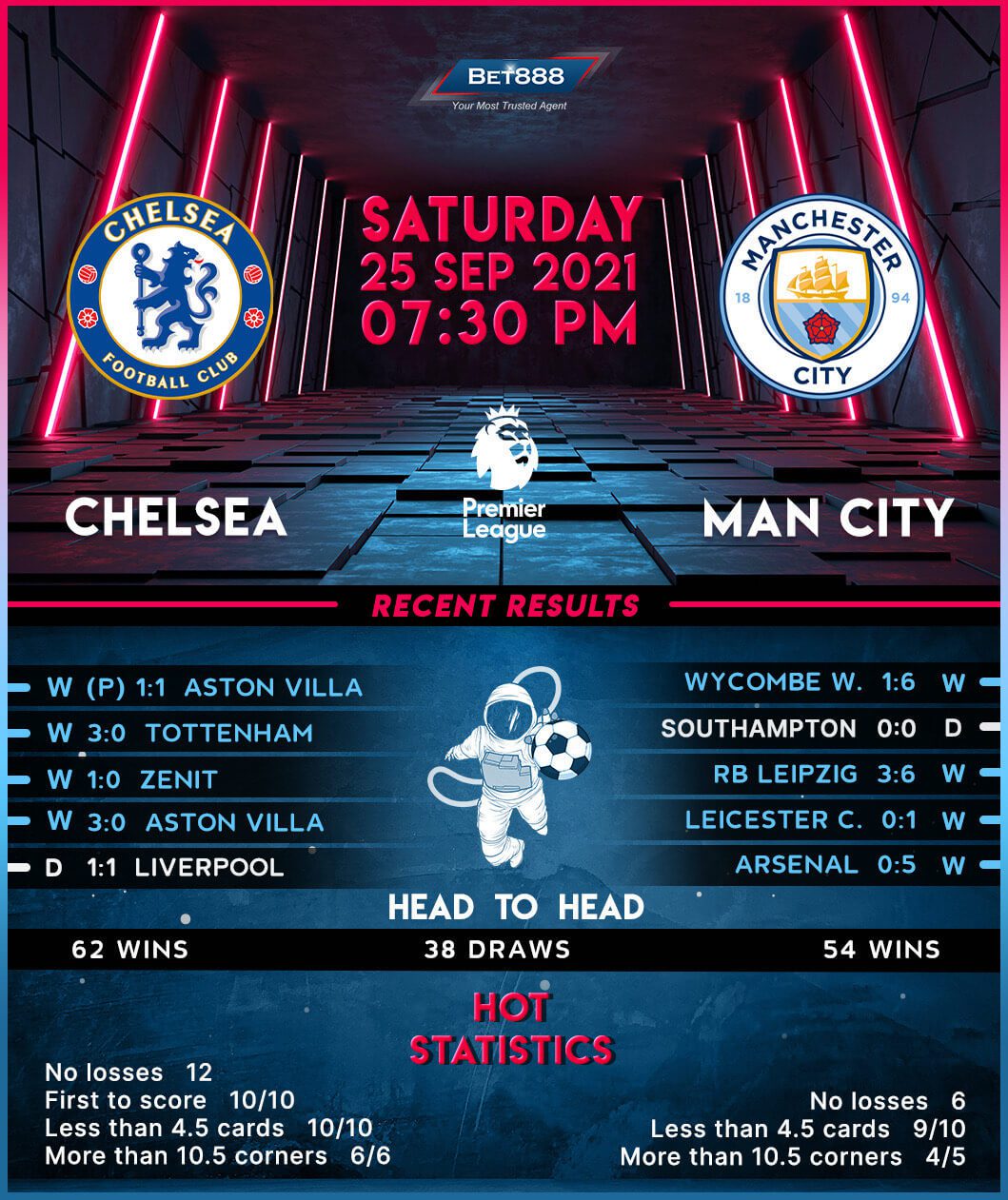 In the meantime, Man City have bounced back from a dismal 1-0 opening day loss to Tottenham, going unbeaten in their subsequent four Premier League matches (W3, D1), including a scoreless home draw with Southampton last time out. Worryingly, though, before eking out a narrow 1-0 victory over Leicester City in their most recent competitive game on hostile turf, the ‘Citizens’ had lost three consecutive fixtures away from the Etihad, failing to score twice in the process. During his trophy-laden managerial career, Pep Guardiola has lost more matches versus Chelsea (8) than against any other opposition and could suffer four straight defeats to a single opponent for the first time. The Spaniard can draw some confidence from knowing Man City have won three of their last six Premier League visits to Stamford Bridge (L3), more victories than they had in their previous 23 travels to this venue in the competition (W2, D8, L13).