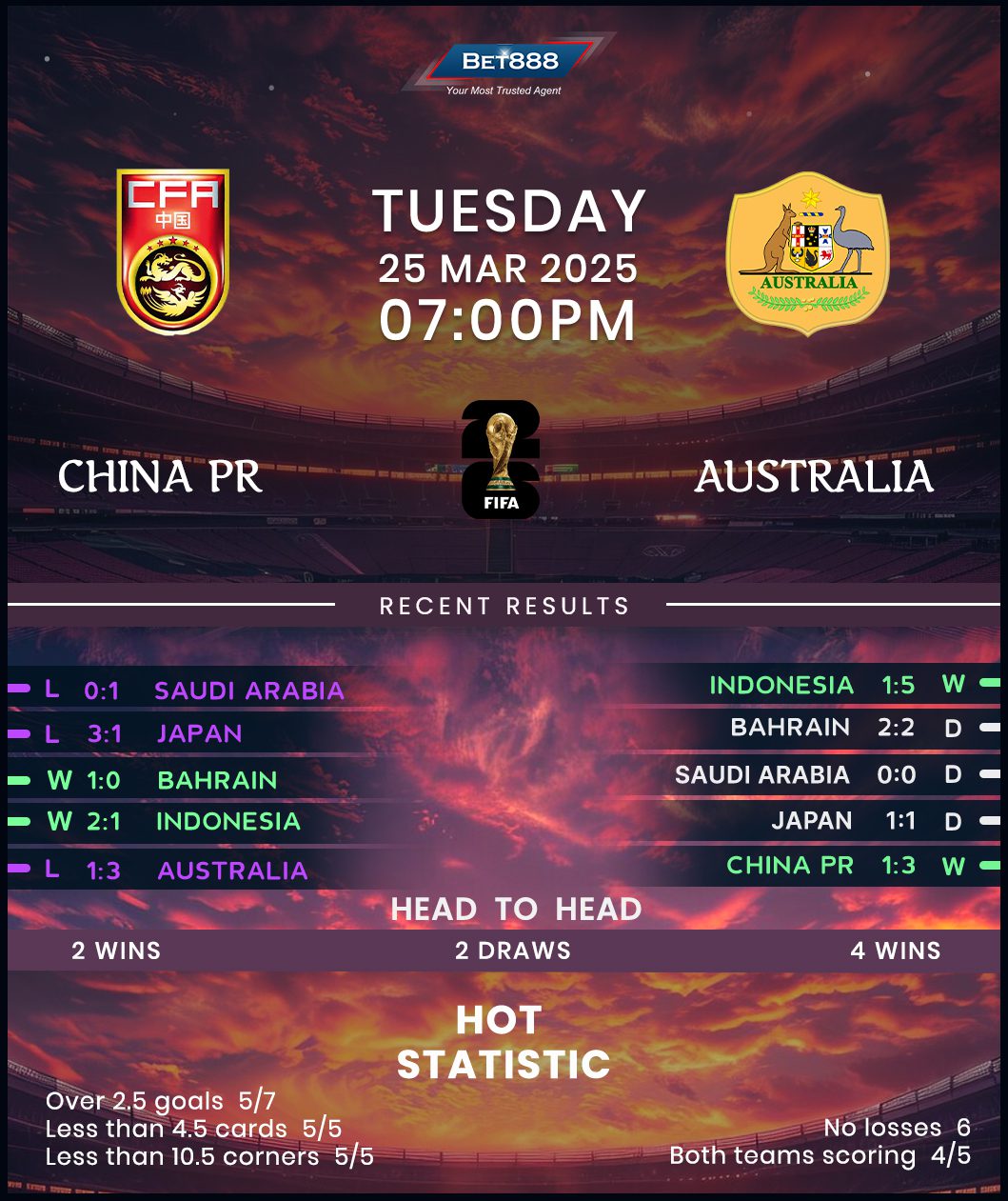 China’s quest to secure a playoff berth remains alive despite a 1-0 defeat at Saudi Arabia last week as they sit level on points with fourth-placed Indonesia pre-round. However, locking down the World Cup finals qualification for the first time since 2002 remains a distant dream after losing five of their first seven Group C fixtures (W2), including the last two in a row. Furthermore, Branko Ivankovic’s men have lost two of their three home qualifiers in the current cycle (W1), with each game (won/lost) featuring over 2.5 goals and both teams on the scoresheet, highlighting the potential for a goal-glutted contest. Adding to this sentiment, three of China’s last five meetings with Australia have produced 3+ goals.