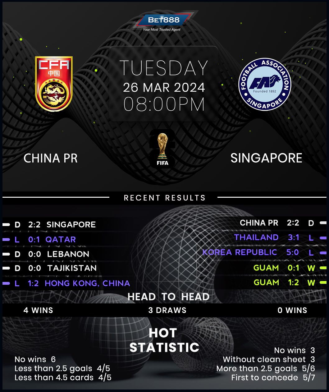 In the meantime, Singapore’s heroic effort in the abovementioned draw barely softened the blow after back-to-back defeats at the start of their qualifying campaign. The visitors’ porous backline has conceded 2+ goals in all three Group C matches at an average of 3.3 per game and will need to step up their defensive effort to bolster their slim hopes of securing a first-ever World Cup appearance. Slow entries have seen Singapore fall behind inside the first ten minutes in their last two qualifying fixtures. But they can draw confidence from going unbeaten on three consecutive travels (W2, D1) before a 5-0 thumping at the hands of South Korea on day one.