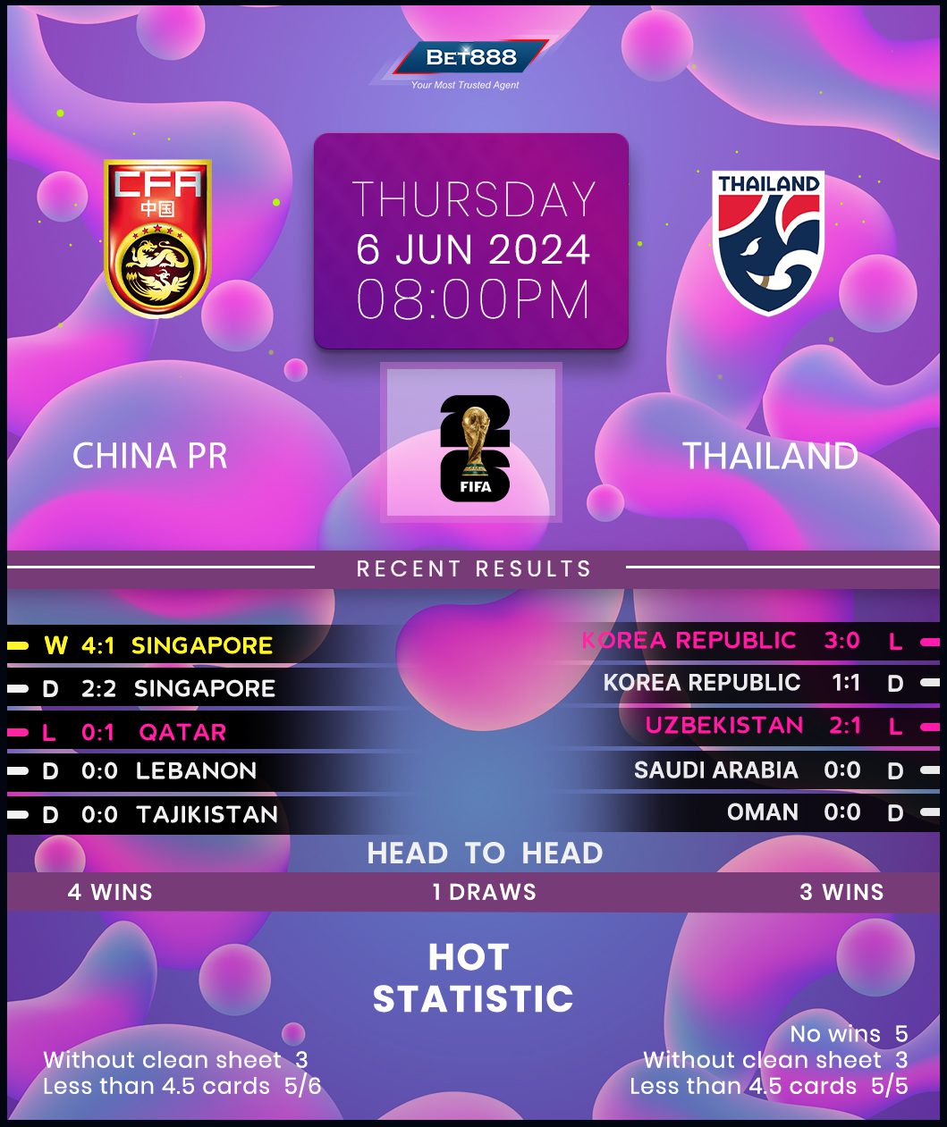 Meanwhile, Thailand’s perennial struggles against China paint a bleak picture, as does the fact they’ve only won once in four Group C games (D1, L2), courtesy of a 3-1 rout of Singapore. If the ‘War Elephants’ need a source of inspiration, they don’t have to look beyond a spirited 1-1 draw against group leaders South Korea on their last travel. Ominously for the traveling fans, that result extended the visitors’ abysmal winless run on foreign soil to five games (D3, L2). With Thailand failing to score in three of those five matches and netting precisely once in the other two, finding the net could be an issue. On a more positive note, they’ve only conceded three goals in their last four away internationals.