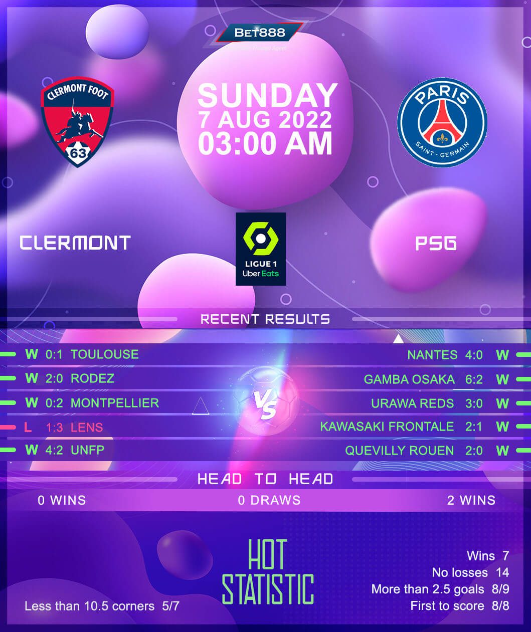 Paris Saint-Germain’s visit will make things even more awkward for Clermont, with new boss Christophe Galtier thrashing Nantes 4-0 in the French Super Cup showpiece to get his fresh experience off to a flying start. Last season’s Ligue 1 triumph helped Paris draw level with Saint-Etienne as the most successful club in French history with ten titles, meaning this could be a record-breaking season for the visitors. There’s plenty of reason for optimism in the PSG camp, especially after Kylian Mbappe pledged his future to the club. The quicksilver forward will be a focal point to break down Clermont as ‘Les Parisiens’ look to win their Ligue 1 curtain-raiser for the eighth season running. That should be a piece of cake, considering they have netted 4+ goals in all three previous competitive meetings with this opposition (W2, D1).
