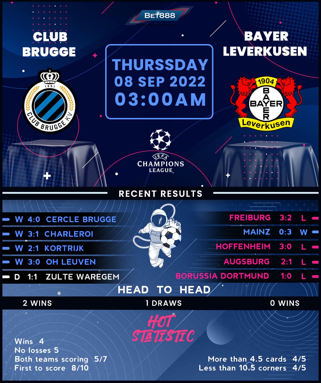 Club Brugge thumped fellow Belgian adversaries Cercle Brugge 4-0 in the final rehearsal ahead of their fourth successive appearance in the Champions League group stages. However, the ‘Blauw-Zwart’ have failed to progress into the competition’s knock-out phase at all nine previous attempts. Carl Hoefkens’ men experienced a thoroughly underwhelming 2021/22 Champions League group stage campaign at home, going winless in all three matches (D1, L2) and conceding more goals (11) than any other home side at the tournament. Yet, after clocking up four wins from five domestic outings at Jan Breydel this season (D1), Brugge will be confident about defying their dismal European record against German clubs. They have only won one of their 13 UEFA-sanctioned fixtures against Bundesliga sides since 2003 (D3, L8), which could put some wind into Leverkusen’s sails.