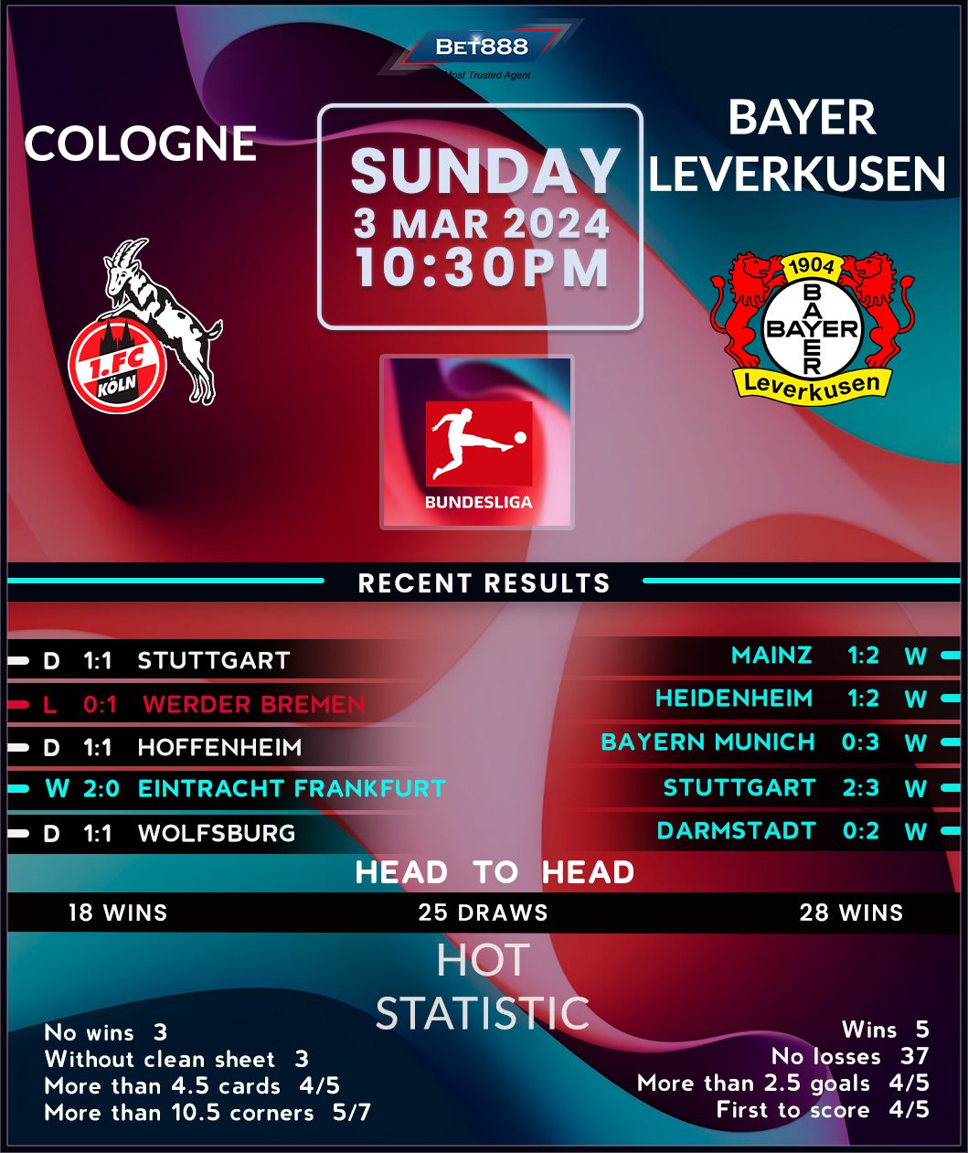 RheinEnergieStadion is the venue as relegation-threatened Cologne and runaway leaders Bayer Leverkusen meet in a lopsided Bundesliga contest.