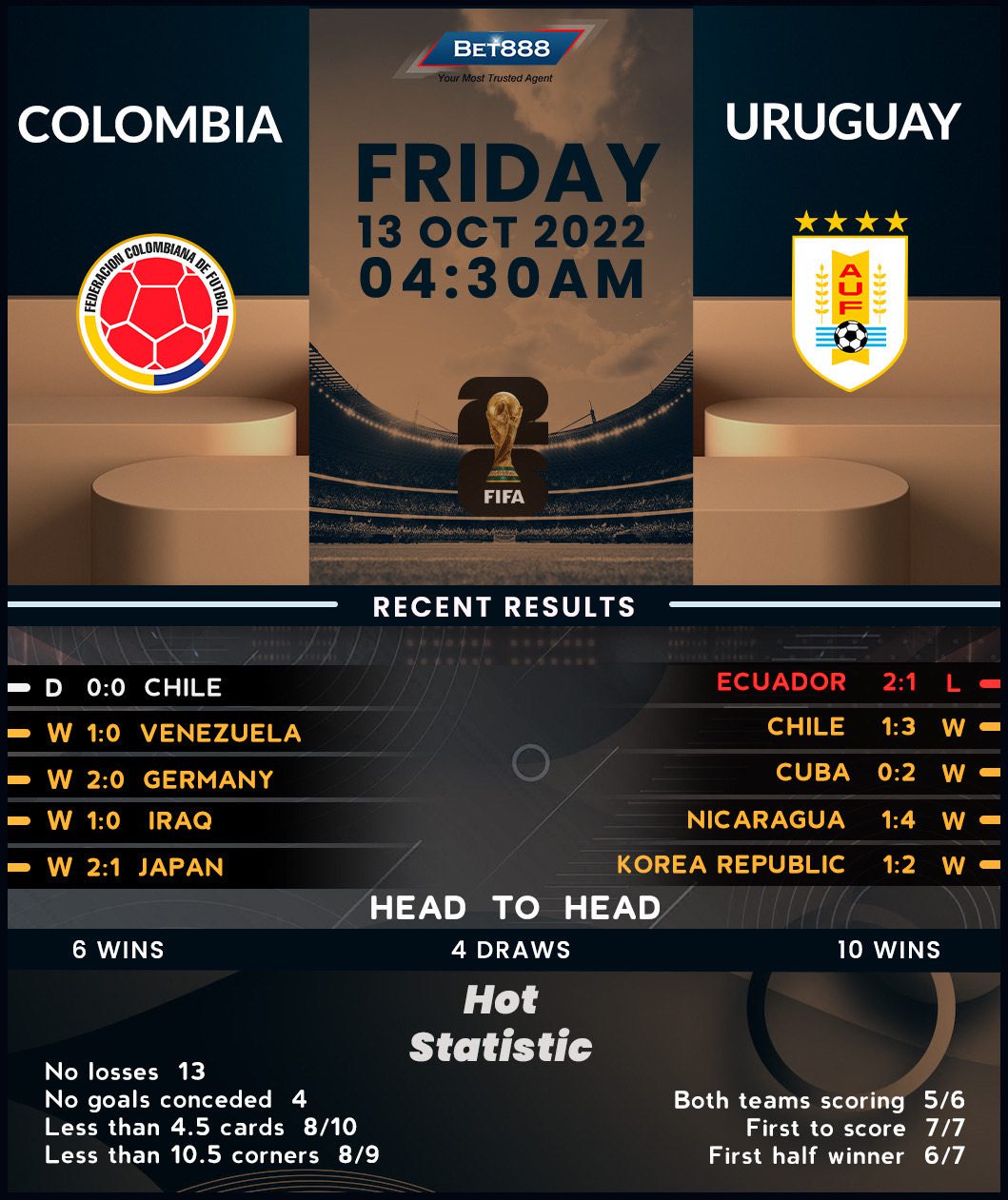After missing out on the 2022 World Cup in Qatar, Colombia’s bid to reach the final tournament for the third time since 1998 has been off to a promising start. Following a narrow 1-0 home triumph over continental minnows Venezuela, ‘Los Cafeteros’ held Chile to a tepid 0-0 draw on the road last time out, displaying another stellar defensive performance. Indeed, Nestor Lorenzo’s men have been a tough nut to crack of late, registering an eye-catching nine shutouts across their last 13 internationals. Lorenzo’s appointment as the new chief of staff in July 2022 has proved a turning point for the sleeping South American giants, as the 57-year-old manager has yet to lose a game in charge (W7, D3). However, with Colombia going winless in their last four World Cup qualifying H2Hs against Uruguay (D2, L2), this clash could be his sternest test yet.