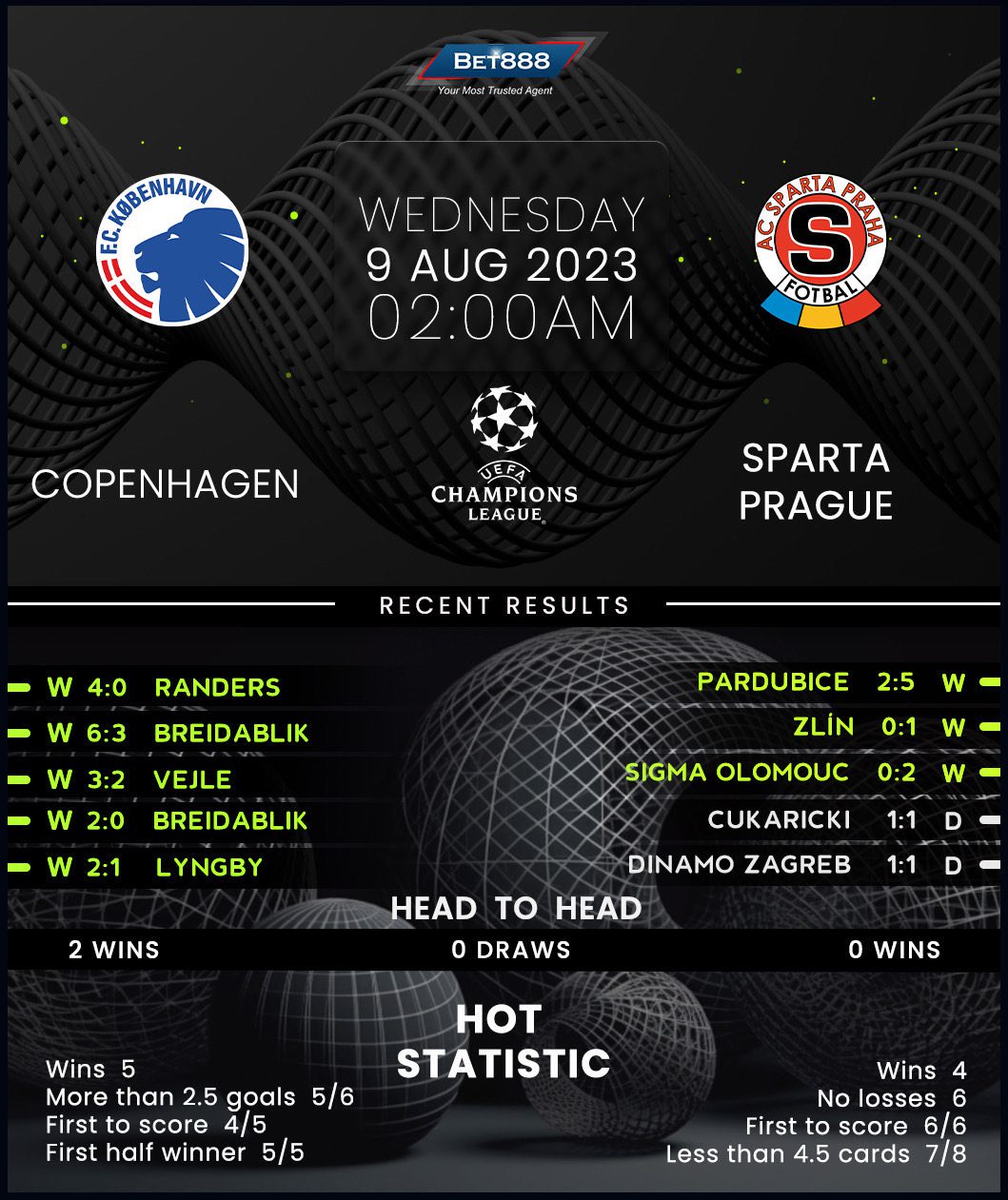 On the other hand, Sparta Prague’s bid to advance into the Champions League group stages for the first time since 2005/06 comes off the back of a first Czech First League crown since 2013/14. Sparta’s domestic title defense has been off to a perfect start as they’ve won all three opening 2023/24 league matches, including an overwhelming 5-2 home triumph over Pardubice at the weekend. However, this won’t be a walk in the park by any stretch of the imagination, with Sparta losing both their previous meetings with Copenhagen by a combined score of 4-0. On a more positive note, the ‘Maroons’ have drawn their last two European games on Danish soil, most recently holding Copenhagen’s arch-rivals Brondby to a scoreless stalemate two years ago.