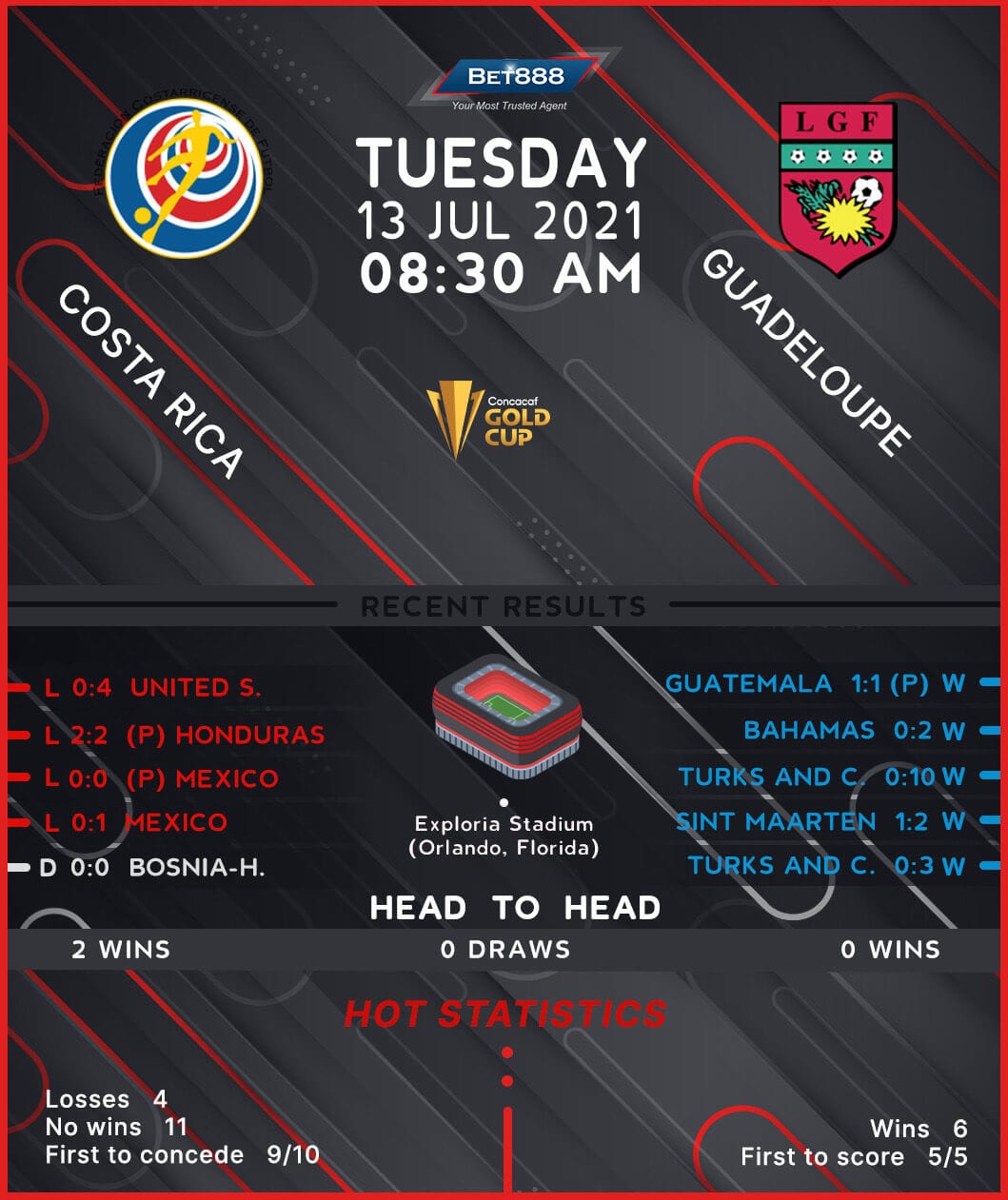 Even though they go into this encounter winless in their last 11 internationals in a row (D5, L6 – 90 mins only), Costa Rica are odds-on favorites to mark their tournament opener with a win. The Costa Ricans boast a 100% H2H record against Guadeloupe at the Gold Cup, having won their previous two meetings in the competition by an aggregate scoreline of 6-1. However, a lack of firepower up front has seen Costa Rica fail to get on the scoresheet in four of their last five outings. ‘Los Ticos’ can’t draw much confidence from their defensive form either, considering they have managed just two clean sheets in 12 internationals, conceding 2+ goals in the last two on the spin. Disappointing second-half displays have seen four of their last six goals conceded come beyond half-time.
