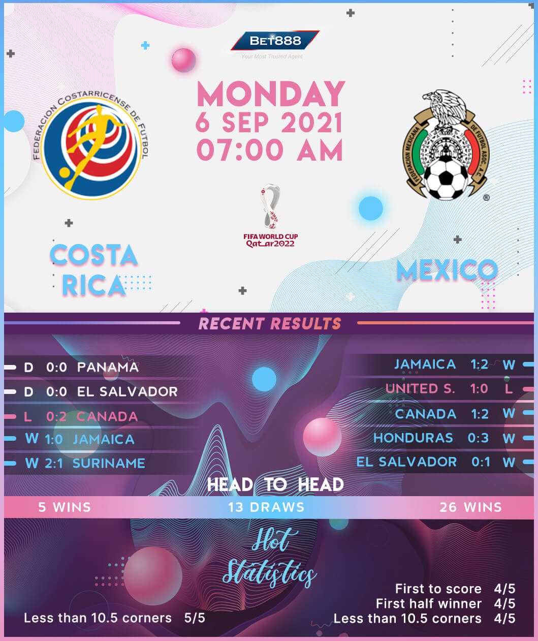 Meanwhile, after suffering penalty shoot-out heartbreak against the United States in the 2021 Gold Cup grand final, Mexico claimed a tight 2-1 home win over Jamaica in their first 2022 World Cup qualifier. Defensive robust, the Mexicans have registered eight clean sheets in ten internationals since the CONCACAF Nations League grand final defeat to the USA in early June. ‘El Tri’ should be able to achieve that feat here as they’ve kept Costa Rica at bay in both previous H2Hs (D2 – 90 mins only). Odds-on favorites to seal a berth in Qatar 2022, Mexico have qualified for the World Cup finals in each of their last eight attempts since missing out on ‘Spain 1982.’ Indeed, they reached ‘Russia 2018’ in emphatic fashion, losing just one of their 16 games in that qualifying campaign (W11, D4).
