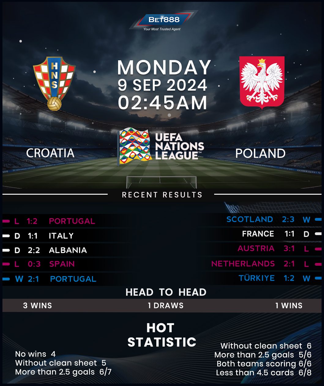 With each of those three fixtures also featuring under 1.5 goals, traveling fans cannot expect a spectacular contest in Osijek. However, against this low-scoring backdrop, Poland bounced back from a dire group-stage exit at Euro 2024 with a goal-glutted 3-2 away win against Scotland in their curtain-raising Group A1 outing, scoring as many goals in that match as they did in three Euro games earlier in the summer. On top of that, Poland’s last six internationals have produced a stunning average of 3.5 goals per game, highlighting the potential for a blockbuster affair. After losing their first three away matches of 2023, Michal Probierz’s charges have won their last three outings on foreign soil, racking up two clean sheets.