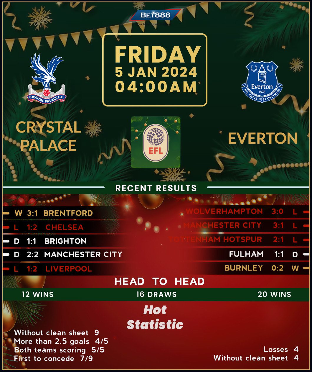 Crystal Palace couldn’t have imagined a better way to cap off a tumultuous 2023, beating fellow London rivals Brentford 4-0 on home turf to arrest a dismal eight-game winless streak in all competitions (D3, L5). It was an ideal way to prepare for this fixture, one they’ll take seriously after losing to this opposition 3-2 in the Premier League earlier this season. However, the last time Palace and Everton faced each other in the FA Cup, Roy Hodgson’s side obliterated the Merseyside outfit 4-0 in March 2022 en route to reaching the semi-finals. Yet, it’s also the only time they’ve progressed beyond round three across the past four campaigns, suggesting their bid to post back-to-back competitive wins for the first time since August/September is in limbo.