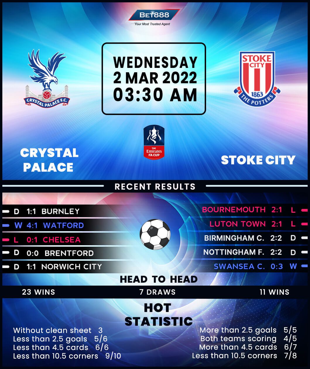 Mid-table Premier League side Crystal Palace will be looking to book their place in the FA Cup quarter-finals when they take on mid-table Championship outfit Stoke City at Selhurst Park.
