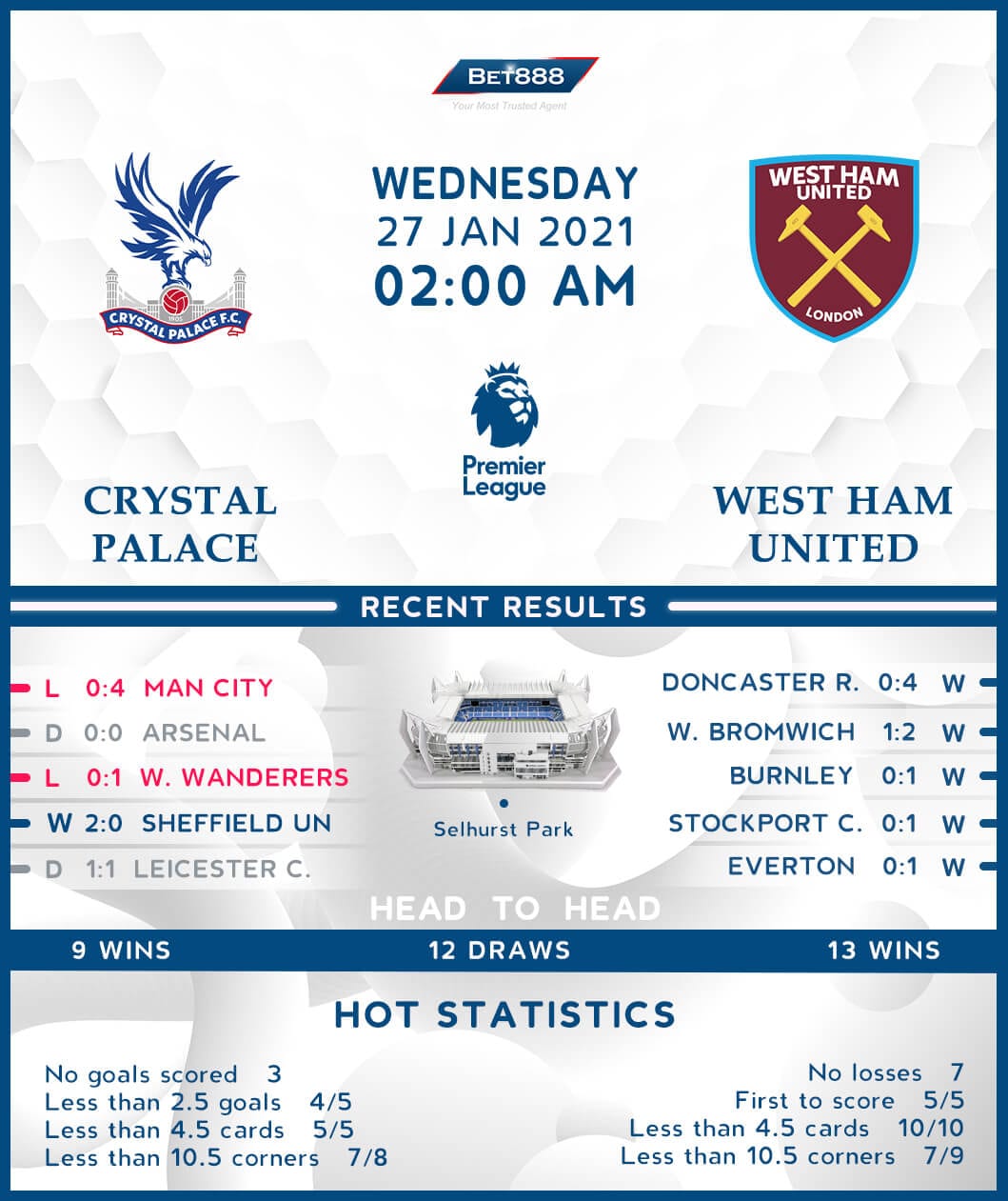 On the other hand, West Ham have been going from strength to strength since suffering a 3-0 defeat at Chelsea in early December, going unbeaten in seven competitive games in a row since then (W5, D2), and winning the last five. In the Premier League alone, the ‘Hammers’ have kept a blank sheet in three of their four previous matches (W3, D1). But, they netted under 1.5 goals three times across that same four-game sequence. The ‘clean-sheet’ theme remains quite significant in the context of West Ham’s recent away fixtures, as five of the last six have seen one or both sides fail to hit the net. Despite succumbing to a 2-1 loss at Selhurst Park last season, the visitors can find some comfort in the fact they have never lost back-to-back Premier League games at this venue.