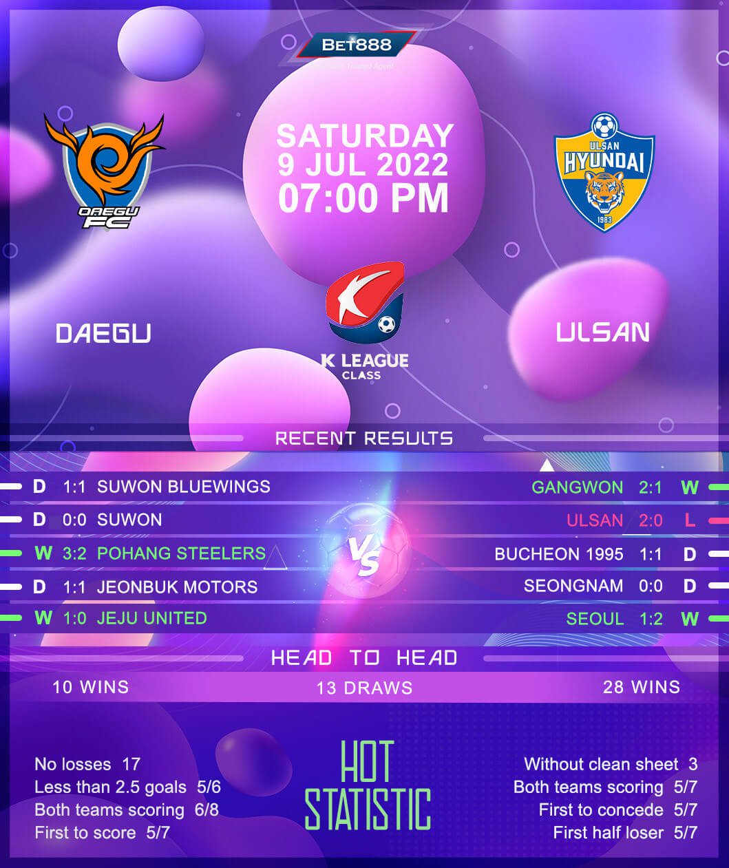 K League 1 leaders Ulsan Hyundai take a trip to the DGB Daegu Bank Park to take on playoff hopefuls Daegu.