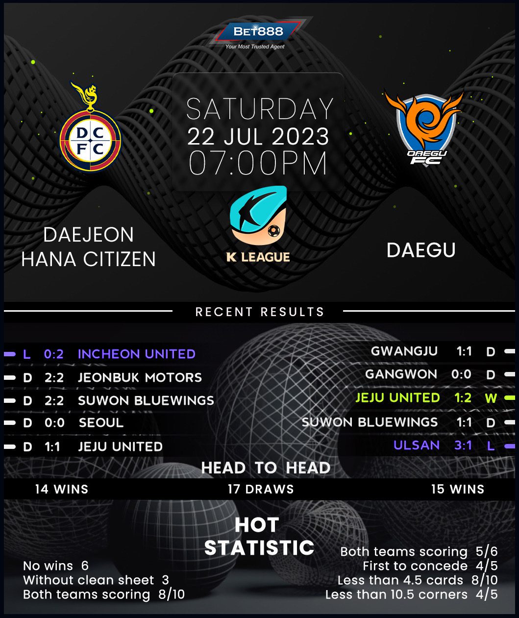 Daejeon’s rather unimpressive run of five successive K League 1 draws ended abruptly last weekend as they slipped to a disheartening 2-0 loss at the hands of high-flying Incheon United. Despite last winning a league fixture in early June, the hosts remain firmly in a playoff conversation, trailing 6th-placed Gwangju by a single point. However, under-pressure manager Lee Min-sung may not weather the storm unless his underachieving men arrest a dreadful five-match winless top-flight run on home soil (D3, L2). It could prove easier said than done against a Deagu side they’ve failed to beat across their last three K League 1 H2Hs at home (D1, L2), frustratingly drawing a blank in both defeats.