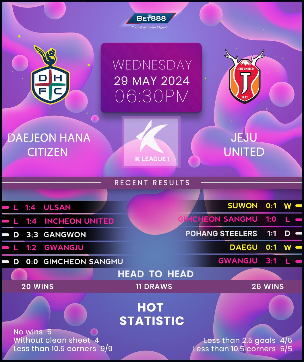 Daejeon World Cup Stadium is the venue as Daejeon Hana Citizen and Jeju United go head-to-head in a bottom-half K League 1 showdown.