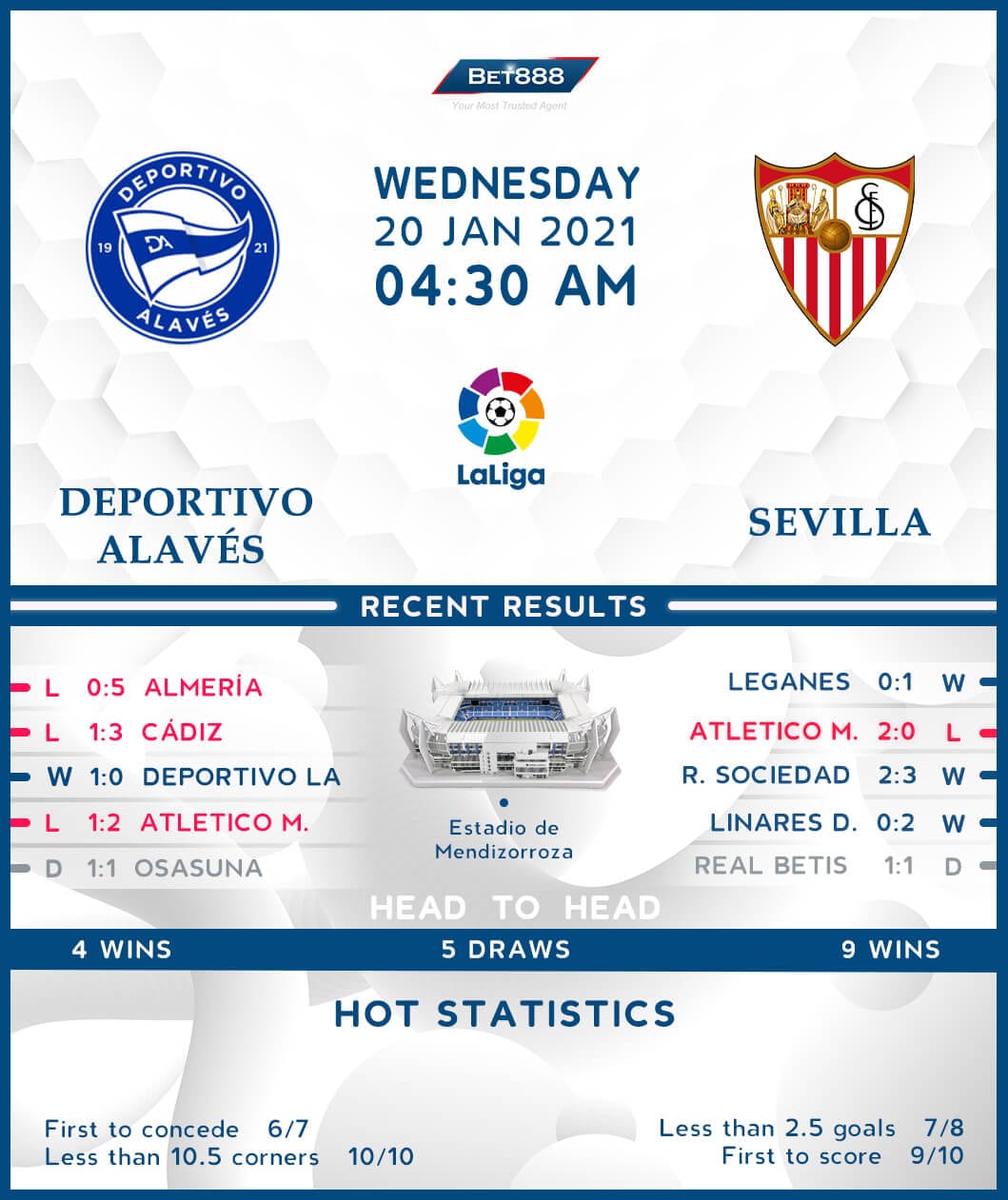 Estadio Mendizorrotza is the venue, as Deportivo Alaves and Sevilla meet in a potentially low-scoring La Liga game. All of their last seven top-flight meetings have featured under 2.5 goals.