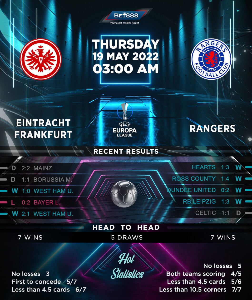Even though they had to settle for a first bottom-half Bundesliga finish in five years, Frankfurt could still make history this season and become the first-ever German side to win the Europa League. Forty-two years since conquering the UEFA Cup, ‘Die Adler’ will be out to maintain their unbeaten continental record on Spanish soil (W4, D1) and take home the first European silverware in the 21st century. Oliver Glasner’s lads have enjoyed a stellar Europa League campaign thus far, reaching the grand final without suffering a single defeat from the group stage to the final (W7, D5). Except for a 1-1 draw at Fenerbahce on Matchday 6, Frankfurt have won their remaining five Europa League games outside Germany this term, including all three in the knock-out stages. Interestingly, Frankfurt’s two previous European meetings with Rangers have yielded overwhelming victories, both of which saw them score precisely six goals.