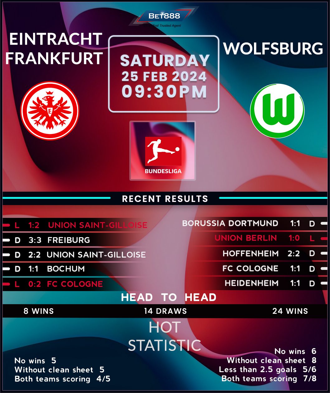 Wolfsburg’s decent H2H form is perhaps the only encouragement they can take amid a disastrous start to the new calendar year. Except for a 1-0 defeat at Union Berlin a fortnight ago, the visitors have drawn their five remaining Bundesliga matches in 2024, four of which yielded an identical 1-1 scoreline. Since beating Frankfurt 2-0 in the reverse fixture, Die Wolfe have only won twice in the Bundesliga (D6, L8), resulting in ending the last round in 12th. Eight points clear of the bottom three, their unbroken stint in the top flight from the 1997/98 season onwards looks safe, but that’s merely a consolation amid another faltering quest to secure European football. Deutsche Bank Park could be a perfect setting to inspire a revival, as Wolfsburg have won six of their last seven visits to this venue (L1).