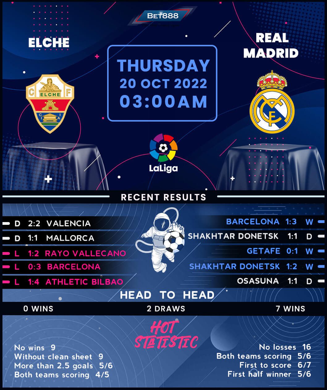 On the other hand, Real Madrid brushed arch-rivals Barcelona aside with an overwhelming 3-1 victory in last weekend’s El Clasico to seize control of the league summit and maintain a 100% unbeaten start to their La Liga title defence (W8, D1). Too hot to handle on the road, ‘Los Merengues’ have won all five of their La Liga matches away from home this season and could make it six in a row for the first time since October 2017. It would take something special from Elche to prevent that from happening, especially considering Carlo Ancelotti’s men have won five times on their last six top-flight visits to Manuel Martínez Valero (D1). Moreover, ‘Los Blancos’ are enjoying a six-game unbeaten away La Liga streak against Valencian sides (W2, D4).