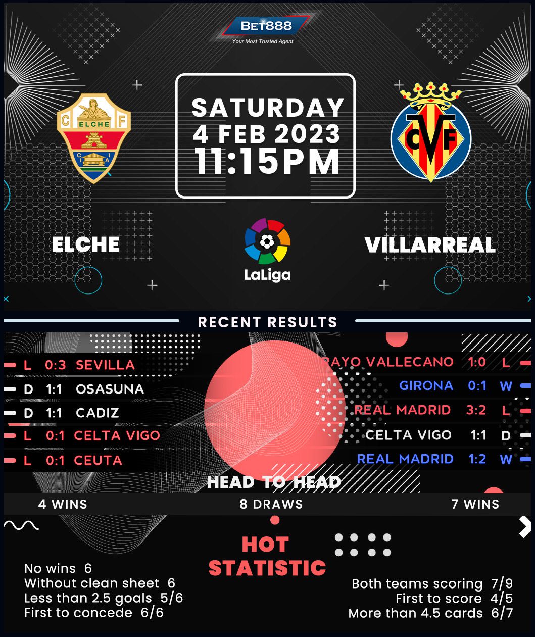 Elche’s abysmal La Liga campaign has continued after the World Cup break, as they’ve gone winless in all five league outings after the restart (D2, L3). As the only side in La Liga yet to pick up a win at the halfway point of the season (D6, L13), it’s no wonder ‘Los Franjiverdes’ already have one foot in the Segunda Division. Stuck a staggering 14 points below 17th-placed Real Valladolid, Pablo Machin’s men can at least hope to salvage some pride by defying an underwhelming nine-game La Liga form against Villarreal (W1, D4, L4). That sounds easier said than done, considering they’ve failed to keep a clean sheet in their last 24 top-flight outings since a 1-0 win against Real Betis in April 2022.
