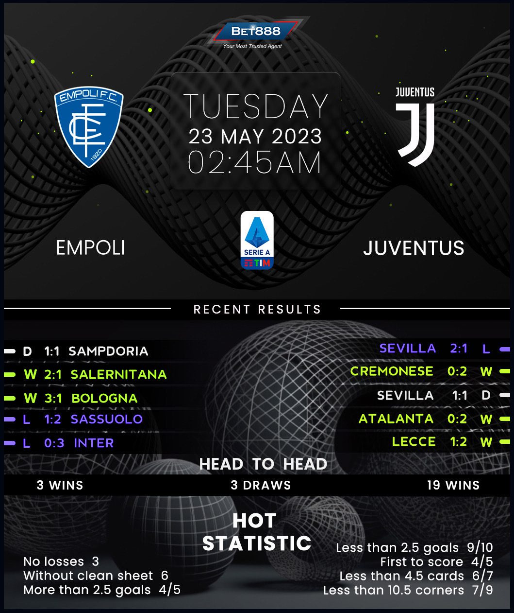 On the other hand, Juventus could take this trip a bit hangover after a heartbreaking 2-1 extra-time defeat in the return leg of their Europa League semi-final tie against Sevilla condemned them to a second consecutive trophyless season. Despite their ill-fated continental campaign, ‘I Bianconeri’ remain in a pole position to ensure another top-four finish in Serie A following a three-game winning league run in the build-up to this journey. Another win at Carlo Castellani would see Massimiliano Allegri’s team tally four league victories on the trot for the first time in over a year. Considering they’ve won a league joint-high 14 encounters against sides starting the round in the bottom half of the standings in 2022/23, they should be confident about walking away with all three points.