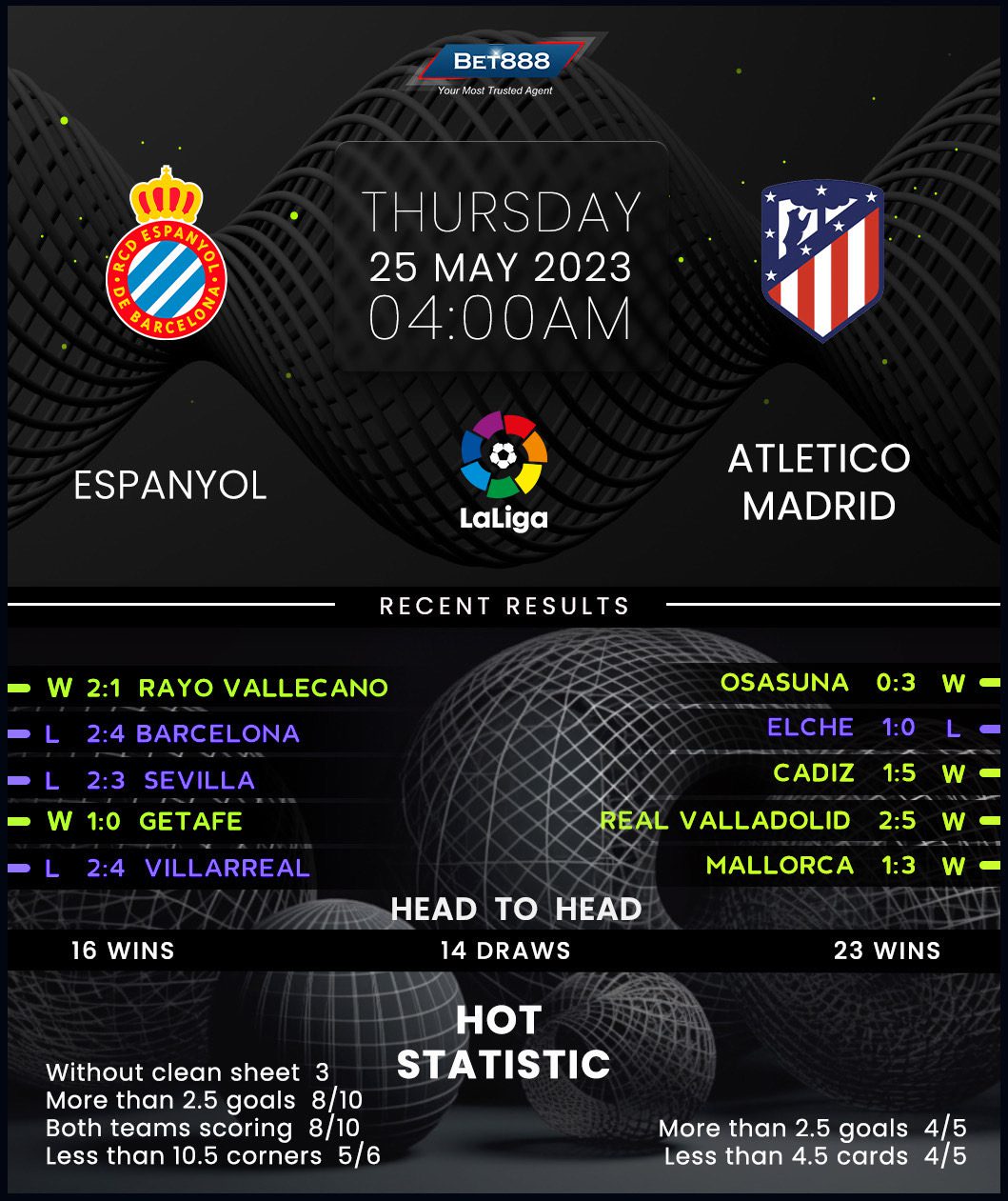 Goals on either side of halftime fired Espanyol to a crucial 2-1 win at Rayo Vallecano last weekend, reinforcing their hopes of extending a two-year La Liga status. But with only three games left and a four-point deficit on safety ominously looming over Los Periquitos’ heads, they’ll likely have to snap a five-match winless league run against Atletico (D2, L3). But that’s easier said than done, considering Luis Garcia’s men have only claimed one win in their last five top-flight outings on home soil (D1, L3), conceding at least twice in each defeat. Another slow start could cost them dearly, given that Espanyol have gone winless in all 12 La Liga home matches this season after letting their opponent draw first blood (D4, L8).