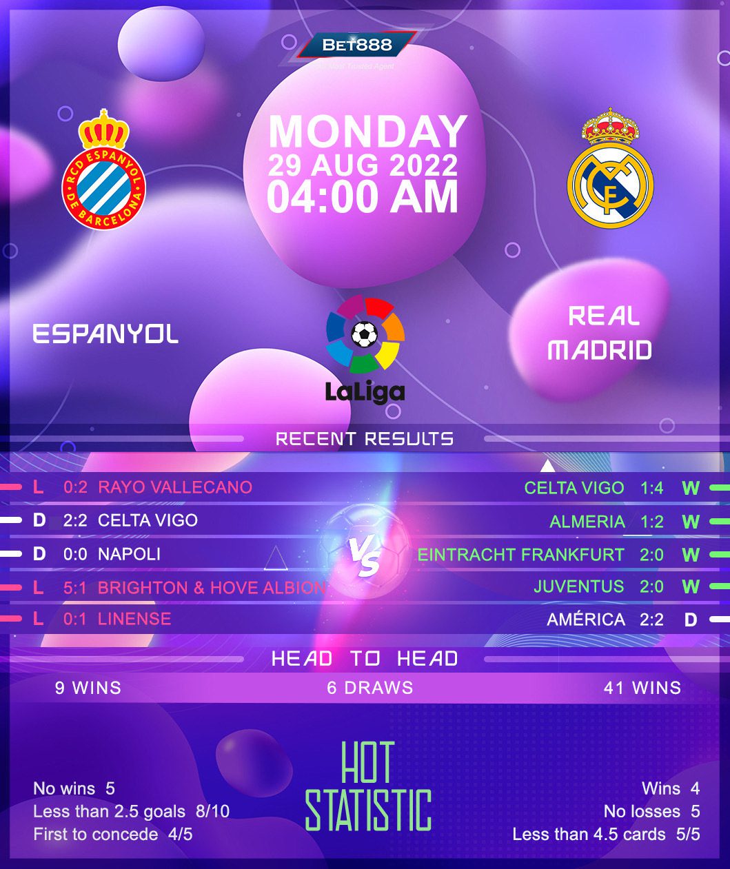 As for Real Madrid, after coming from behind to pull off a 2-1 win at newly-promoted Almeria on matchday one, ‘Los Blancos’ cruised to an overwhelming 4-1 triumph at Celta Vigo last time out. Madrid’s 100% start to the new club season includes a scintillating 2-0 victory over Eintracht Frankfurt in the UEFA Super Cup showpiece. Despite the visitors’ stellar form, manager Carlo Ancelotti will be keen to tighten up his team’s backline after seeing them go seven consecutive La Liga away matches without a clean sheet. All eyes will be on Karim Benzema, who has tallied five goals and two assists in his last seven La Liga appearances against Espanyol.