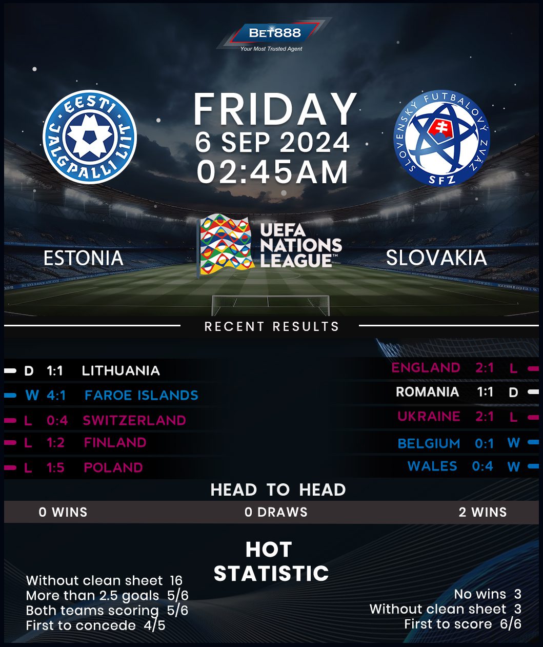 Estonia’s UEFA Nations League Group C/1 gets underway at A. Le Coq Arena as they seek their first win against Slovakia after losing both previous H2Hs.