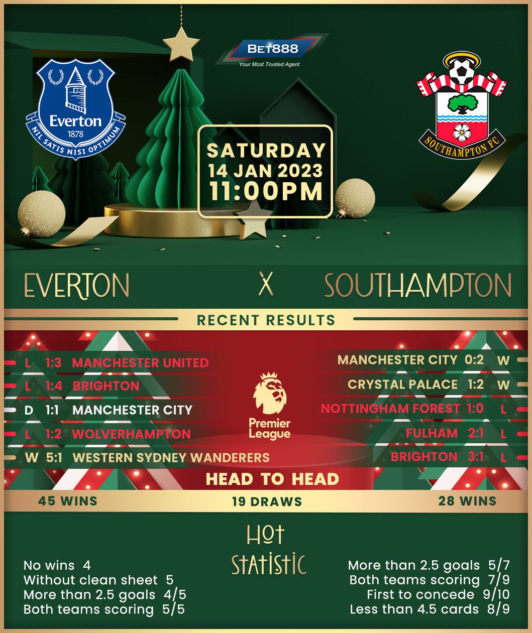 Everton may not yet be in a must-win situation despite entering this round inside the drop zone, but under-pressure boss Frank Lampard is. Lampard’s men capped off 2022 on a high, holding defending champions Manchester City to a 1-1 draw, but their celebrations were short-lived. The ‘Toffees’ started the new calendar year with a whimper rather than a bang, losing 4-1 to Brighton & Hove Albion on home turf, accounting for their third consecutive Premier League defeat at Goodison. Another slip-up would see Everton lose four top-flight home matches in a row for the first time since 1958, which would likely put the final nail in Lampard’s coffin. There’s a glimmer of hope as they’ve gone unbeaten in their last 17 Premier League H2Hs against Southampton at home (W12, D5).