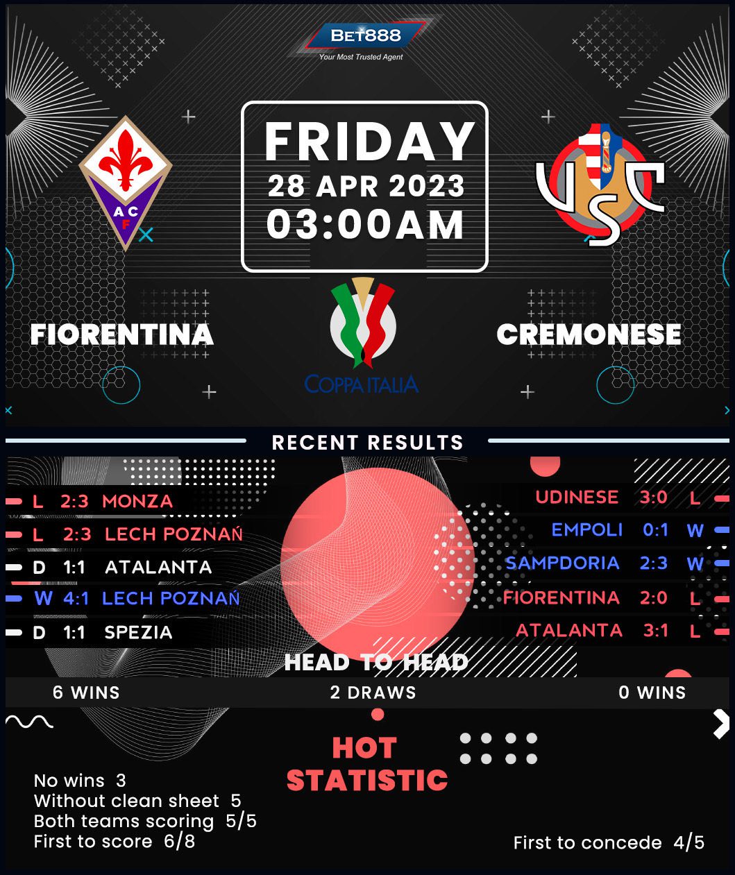 In the meantime, a woeful 3-0 defeat at Udinese last weekend snapped Cremonese’s two-game winning league run and likely condemned them to relegation from Serie A. Adding to the skepticism about the possibility of a major upset, it’s worth noting that the visitors haven’t won by a three-goal margin since their 4-1 victory against Ascoli during their promotion campaign last season. And while four of Cremonese’s seven wins across the entirety of 2022/23 came in the Coppa Italia after they opened the scoring, Davide Ballardini’s lads have let Fiorentina draw first blood in all three meetings this season (L3). Having won just one of their last six competitive away games (D2, L3), they’re unlikely to progress into their first-ever Coppa Italia grand final from only their second semi-final appearance.
