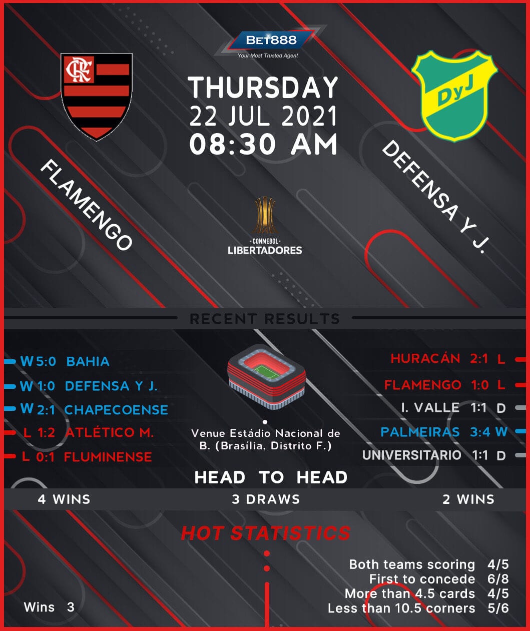 Meanwhile, the visitors head into proceedings in the midst of a rough patch having picked up just one victory in their last eight matches in all competitions (D2, L5). Moreover, a nerve-shredding 4-3 away win over Flamengo’s bitter rivals Palmeiras in their most recent Copa Libertadores trip remains Defensa’s solitary success in six competitive away games (D2, L3). They are now looking to end a run of eight straight travels without a clean sheet, having conceded 2+ goals in 50% of those trips. A lackadaisical finishing could pose a problem for the Argentinean outfit here, considering they’ve scored one goal or less in all but two of their last 13 matches in all competitions. That being said, Sebastian Beccacece’s men have found the net before half-time in three of their previous four competitive games.