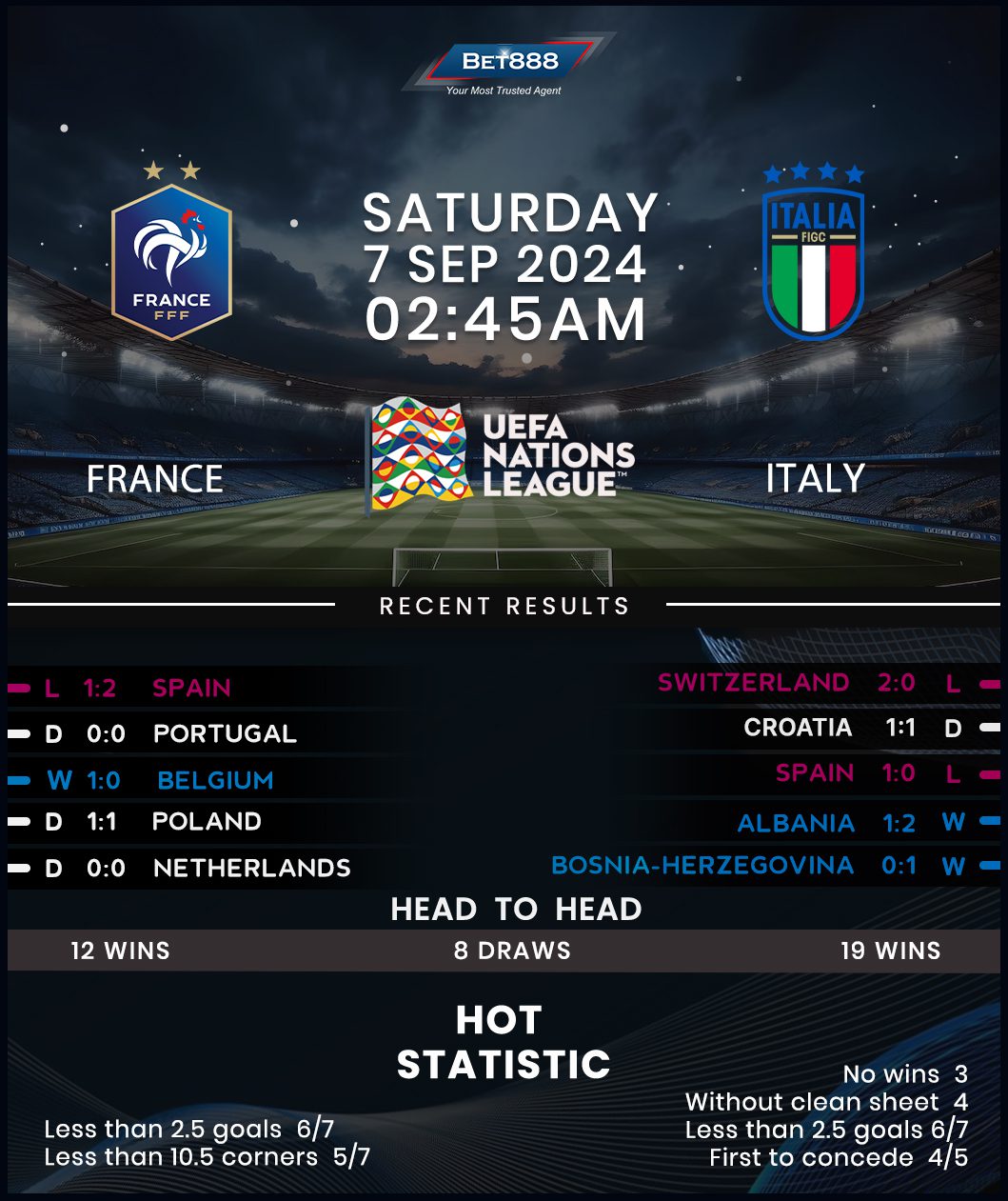 Familiar foes France and Italy go up against each other in their opening game of the 2024/25 UEFA Nations League Group A/2 at the Parc des Princes.