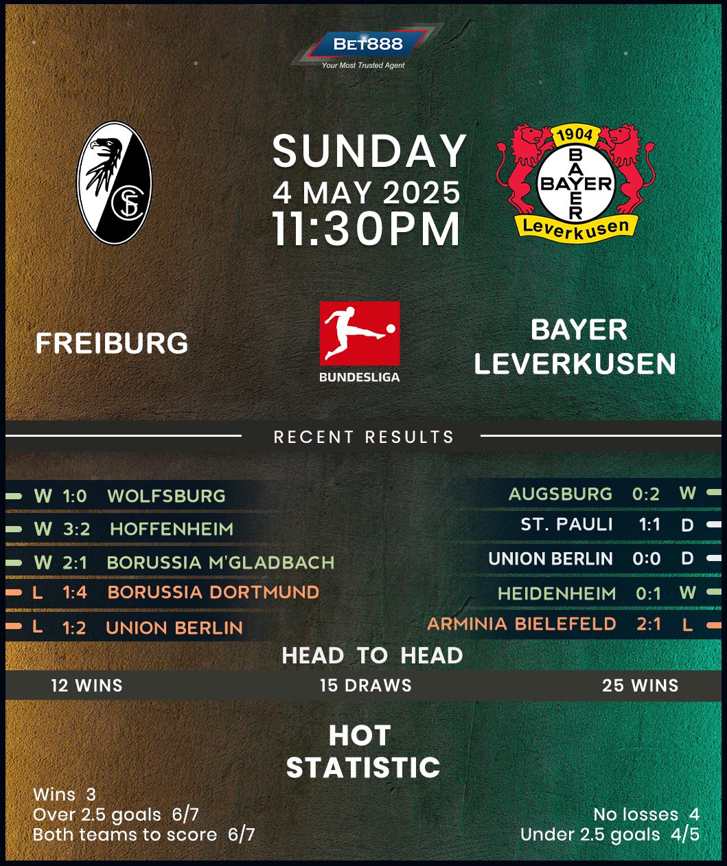 On the other hand, Bayer Leverkusen arrive determined to spoil Freiburg’s Champions League push, buoyed by a comfortable 2-0 victory over Augsburg last weekend that extended their unbeaten run to six Bundesliga matches (W4, D2). Three clean sheets in their past four outings have underpinned that solid form, though their hopes of defending their Bundesliga crown are dead in the water. Despite the underwhelming campaign, Xabi Alonso, who boasts an unbeaten personal record against Freiburg since arriving at Leverkusen (W3, D1), remains one of the favorites to replace Carlo Ancelotti at Real Madrid. However, the visitors have struggled with their away form lately, winning just twice on their last five competitive road trips (D1, L2).