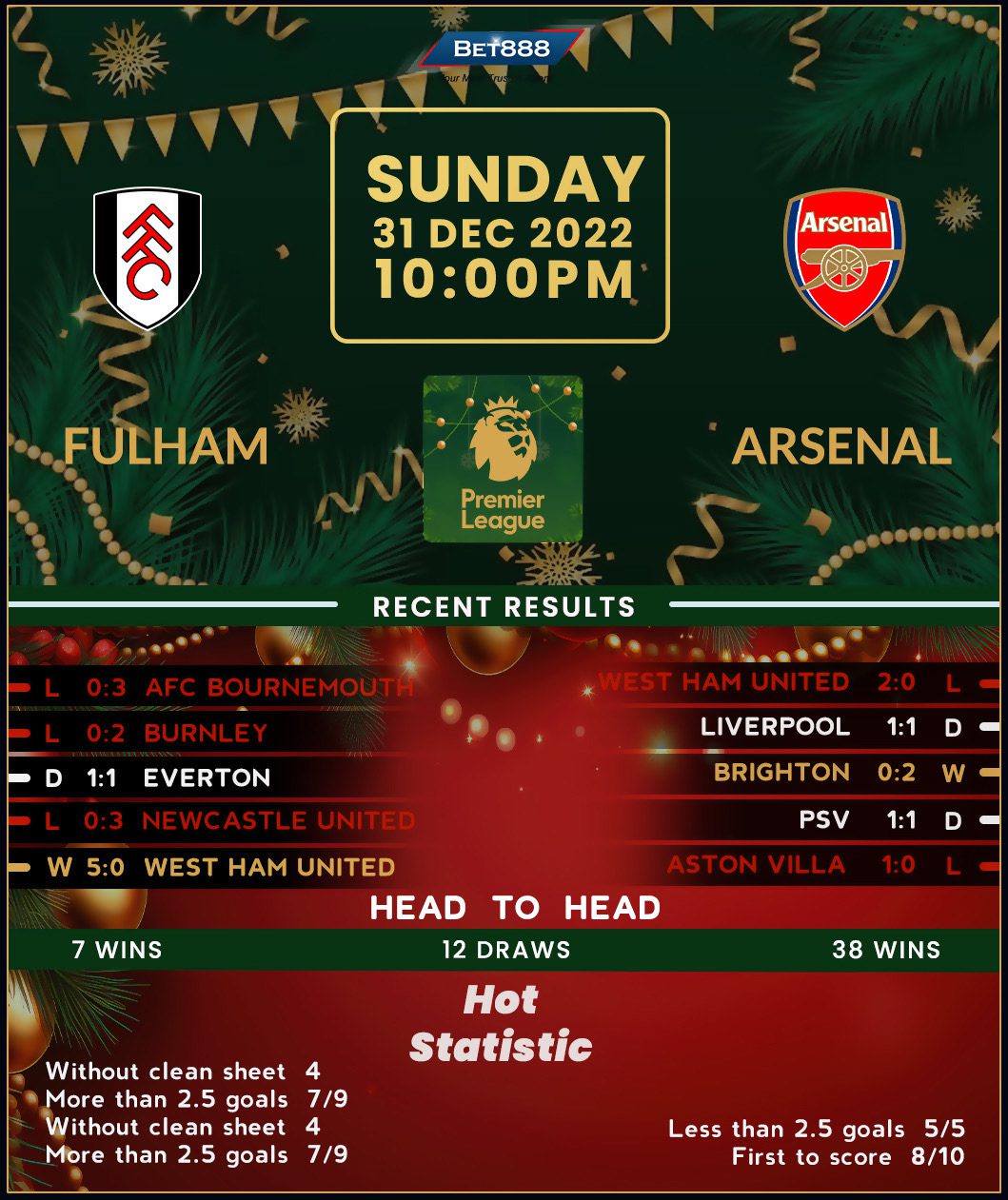 Fulham’s unfathomable dip in form means they’ll finish 2023 in the Premier League bottom half regardless of the outcome at Craven Cottage. After posting back-to-back 5-0 home league wins, Marco Silva’s men have lost their last three top-flight outings without scoring. Their dismal run of form culminated in midweek Premier League action as they slumped to a 3-0 defeat at Bournemouth, falling seven points below the upper half of the standings. While Fulham can draw confidence from holding Arsenal to a spirited 2-2 draw in the reverse fixture in August, it’s worth noting they’ve lost their last five H2Hs on home turf via a combined score of 15-2, conceding 3+ goals on four occasions. Moreover, the ‘Cottagers’ have suffered five defeats ‘to nil’ across the last seven Premier League London derbies they’ve hosted (W1, D1).