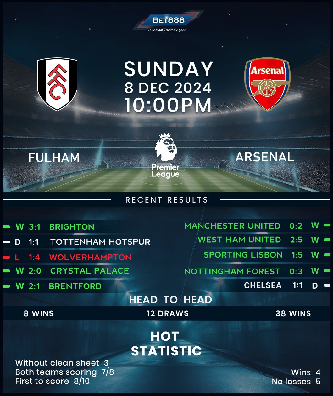 Fulham halted a two-game winless Premier League run (D1, L1) during midweek with an enthralling 3-1 home triumph against Brighton en route to posting their best-ever top-flight point tally after 14 rounds (22). It was also Fulham’s third consecutive home league outing to produce two goals beyond the 75th minute, highlighting the potential for a late drama. Furthermore, each of the Cottagers’ seven Premier League games on this ground in 2024/25 has featured both teams on the scoresheet. That was also the case when Marco Silva’s side stunned Arsenal 2-1 in this corresponding fixture last term to snap an 11-match winless H2H streak (D3, L8). Yet to beat the Gunners in back-to-back meetings this century, Fulham could make a small piece of club history this weekend.