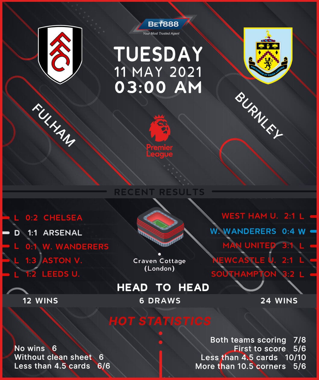 Winless in their last six Premier League outings (D1, L5), Fulham sit nine points adrift of 17th-placed Burnley, with the faintest of hopes of avoiding relegation. The ‘Cottagers’ have won just one of their last 13 home league matches (D4, L8), courtesy of a 1-0 victory over dead-last Sheffield United in mid-February. Since that triumph, Scott Parker’s men have suffered for consecutive home Premier League defeats, drawing a blank on three occasions. Fortunately for Fulham, they are now up against a Burnley side they have outscored in eight of their last nine league encounters on home turf (L1), including both in the Premier League by an aggregate score of 7-2. Having netted just nine goals in 17 home Premier League games this season, Fulham could become the first time in the competition history to fail to reach double digits for home goals in a single campaign.