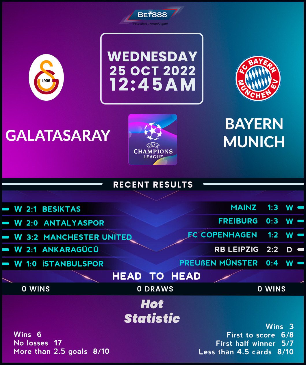 On the other hand, Bayern Munich’s bid to reach the Champions League group stages for the 15th successive season and live up to their tag as Group A favorites has been off to a perfect start, with Thomas Tuchel’s side beating Man Utd 4-3 before a fightback from a 1-0 down to win 2-1 against Copenhagen last time out. The ‘Bavarians’ have been scoring for fun on the road this term, netting 2+ goals on all six travels across all competitions (W5, D1), including a 3-1 romping of Mainz 05 at the weekend. That same scoreline saw them overcome Galatasaray’s fellow Istanbul rivals Besiktas on their most recent visit to Turkey, extending their undefeated record against Turkish sides to six matches on the trot (W5, D1).