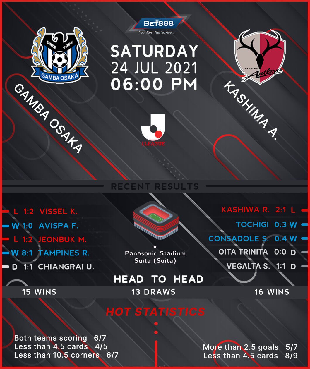Gamba Osaka and Kashima Antlers go head-to-head at the Panasonic Stadium Suita in an exciting J1 League clash.