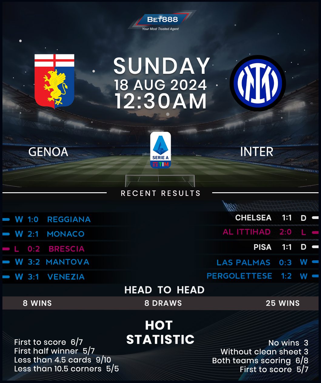 On the other hand, Inter Milan lifted a landmark 20th Scudetto last season in remarkable fashion, leaving second-placed AC Milan a whopping 19 points behind. Simone Inzaghi’s side only lost twice in 38 league matches in 2023/24, going down to the relegated Sassuolo each time (W29, D7). Despite their dominant title run, ‘I Nerazzurri’ cannot afford to rest easy, knowing the last four reigning holders have failed to defend their title, including Inter three years ago. The visitors will, nonetheless, seek a flying start. They’ve commenced their last five Serie A seasons with a win, but their recent visits to Luigi Ferraris have not gone to plan. After three consecutive league wins at this venue by 2+ goals ‘to nil,’ they’ve drawn two in a row, netting just one goal. .
