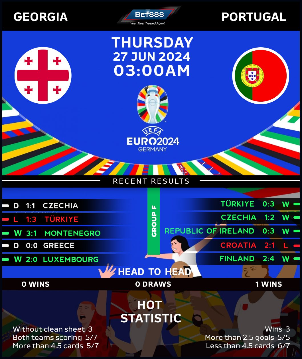 Georgia bounced back from a 3-1 romping at the hands of Turkey on day one, holding the Czech Republic to a 1-1 draw last time out to put their first points on the board on a major tournament debut. But the lowest-ranked nation at Euro 2024 must beat a more heavily fancied Portugal to advance into the knockouts, which is a tall order, considering they’re up against one of the pre-tournament favorites. With the Selecao already booking a knockout berth, Willy Sagnol’s men will rely on potential complacency within the opposition ranks as they bid to upset the odds in Gelsenkirchen. Despite their minnow status, the Crusaders are no idle attacking threat, having netted in ten of their last 11 internationals. Breaking the deadlock could be paramount, especially with Georgia going unbeaten in 18 consecutive matches after scoring first (W16, D2).