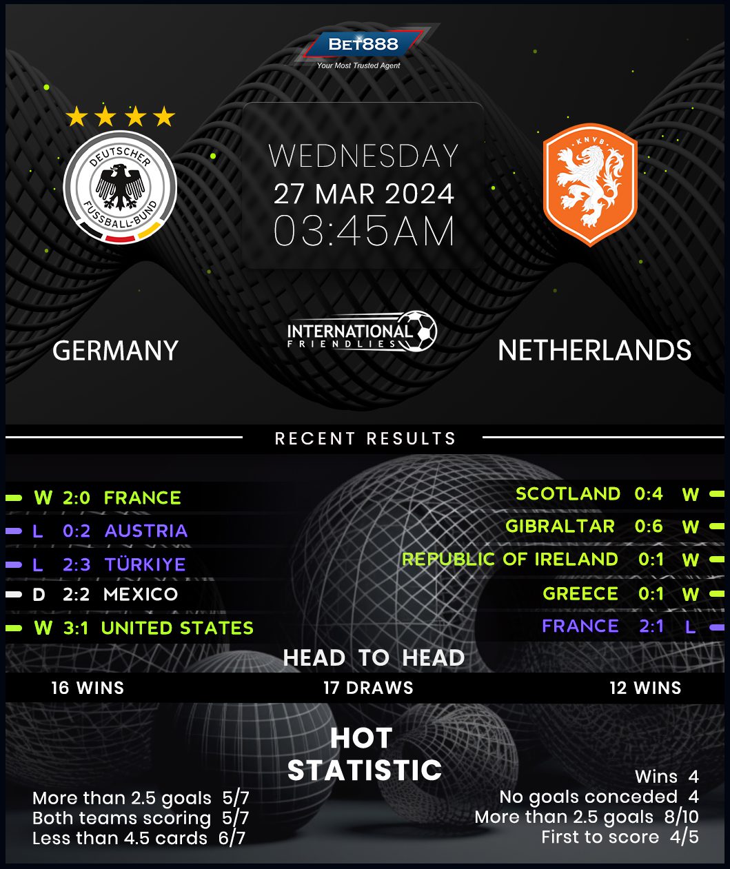 On the other hand, the Netherlands breezed past Germany’s Euro 2024 group rivals Scotland 4-0 in their first game of 2024, making it four victories ‘to nil’ on the trot. By extension, Ronald Koeman’s free-flowing team has racked up six triumphs in their last seven internationals (L1), five of which came without conceding. Despite heading into proceedings as pre-game outsiders, the Oranje can draw confidence from avoiding defeat in ten of their last 13 showdowns against Germany (W4, D6). But with three of their four most recent H2Hs ending all square, there’s no room for complacency. Connoisseurs of action-packed football will look forward to this encounter, knowing three of those four encounters saw both sides get on the scoresheet at least twice.