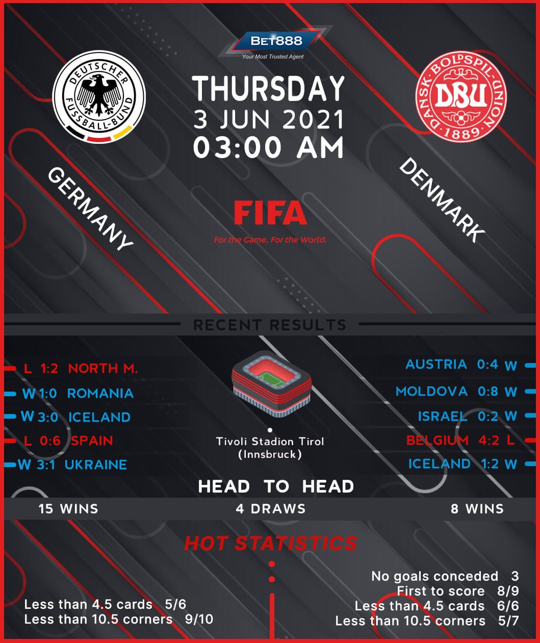 On the other hand, Denmark have put together three successive victories by an aggregate score of 14-0 since suffering a 4-2 away defeat to Belgium in the UEFA Nations League back in November 2020. That loss to Belgium remains Denmark’s solitary failure across their last ten matches, friendlies included (W8, D1). Virtually impenetrable at the back, the ‘Danish Dynamite’ kept a clean sheet eight times during that ten-game sequence. Another bright spot has been Denmark’s propensity for scoring, with Kasper Hjulmand’s side bagging 2+ goals in each of their last six fixtures at an average of 3.33 per game. Against this backdrop, they have netted precisely once in three of their previous four clashes against Germany.
