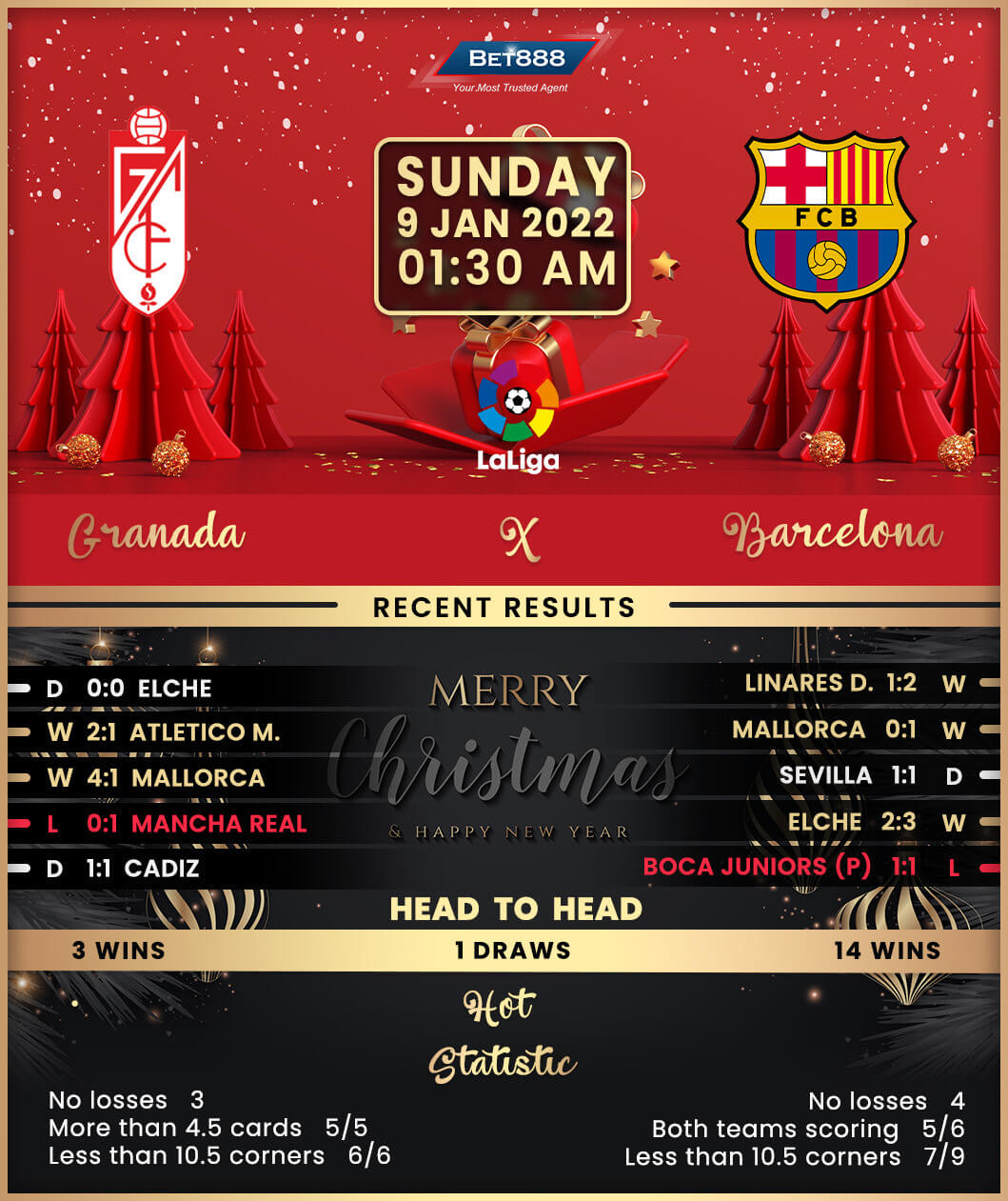 Meanwhile, Barcelona have racked up back-to-back competitive wins to paint the start of 2022 with flying colours, including a come-from-behind 2-1 victory at lower-league outfit Linares in midweek Copa del Rey action. After pulling off a narrow 1-0 triumph at bottom-half Mallorca in their opening La Liga game of 2022, the struggling Catalan heavyweights could win consecutive top-flight away games for the first time this season. However, with a host of first-team stars sidelined with Covid-19 and injuries, head coach Xavi Hernandez’s bid to whittle down a one-point deficit on fourth-placed Atletico Madrid could face an acid test here. However, with Barcelona losing just one of their last nine La Liga fixtures (W4, D4), the visitors will fancy their chances at Granada, where they’ve won four of their previous five top-flight H2Hs (L1) by at least a two-goal margin.